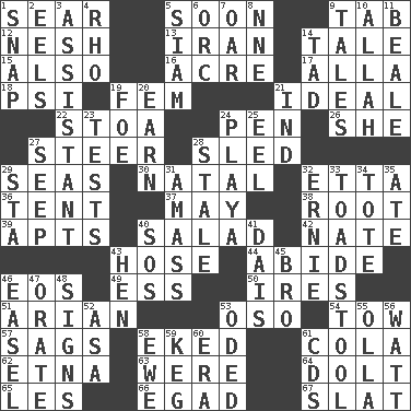 ACROSS 1. Singe 5. Within a short period 9. Keyboard key 12. Delicate 13. SW Asia republic 14. Falsehood 15. In addition 16. Land measure 17. Silent film actress Nazimova 18. 23rd letter of the Greek alphabet 19. Opposite of masc. 21. Perfect 22. Portico 24. Fenced enclosure 26. A female animal or person 27. Guide 28. Downhill vehicle 29. Oceans 30. Brizilian seaport 32. Singer James 36. Portable shelter 37. Can I? 38. Carrot, for example 39. Flats, for short 40. Vegetable dish 42. Nathan's nickname 43. Stockings 44. Remain 46. Greek goddess of the dawn 49. Double-curved letter 50. Angers 51. Believer in; advocate of (suffix) 53. Bear (Spanish) 54. Pull behind 57. Droops 58. Supplemented with great effort 61. Root beer relative 62. Inactive volcano in Sicily 63. Past tense of be (plural) 64. Dunce 65. French article 66. Mild oath 67. Narrow board DOWN 1. Fastener 2. Snakelike fish 3. Helper 4. 17th letter of the Greek alphabet 5. Thailand, formerly 6. The grampus (Milton) 7. Rowing implement 8. Compass dir. 9. Falsehoods 10. Assad's deity 11. Memphis, Tenn. Street 14. Bit 19. Enemy 20. Merit 21. Indiana (abbr.) 23. Trials 24. Beach, in Buenos Aires 25. Snakelike fish 27. Ooze 28. Lacking originality or spontaneity 29. R.R. building 31. Collect or gather 32. Bert's buddy 33. Inedible or poisonous agaric 34. Haul 35. Had dinner 40. Distress signal 41. Raised platform 43. Layer 45. Sis' sibling 46. Artist's stand 47. Speak pompously 48. Public displays of written messages 52. White ___ sheet 53. Wrote a lyric poem 55. Water jar 56. Electrical Unit 58. She-sheep 59. Barrel 60. Epoch 61. Music discs