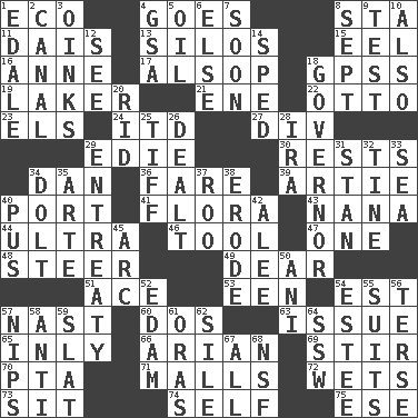 ACROSS 1. Environmental prefix 4. Moves 8. R.R. building 11. Raised platform 13. Grain storage towers 15. Snakelike fish 16. Queen of England 1702-14 17. Columnist Joseph or Stewart 18. Global Positioning Systems (abbr.) 19. Member of a famous L.A. basketball team 21. Compass dir. 22. "Beetle Bailey" pooch 23. Raised railways 24. It would 27. HTML Container Element 29. Singer Brickell 30. Musical pauses 34. Daniel's nick name 36. Conductor's collection 39. Nick name for Arthur 40. Left side of a ship or aircraft 41. Plants 43. Nanny 44. Extreme 46. Utensil 47. Single 48. Guide 49. Letter starter 51. Adept person 53. Car or cant ending 54. Eastern Standard Time (abbr.) 57. Political cartoonist Thomas 60. Two (Sp.) 63. Come out of 65. Inwardly 66. Believer in; advocate of (suffix) 69. Agitate 70. Parent Teacher Association (abbr.) 71. Shopping centers 72. Moistens 73. Be seated 74. Automatically 75. Compass dir. DOWN 1. Peak District village in England 2. Lessep's creation 3. Pig sounds 4. Girls' org. (abbr.) 5. Petroleum 6. Otherwise 7. Within a short period 8. Back-to-school mo. 9. Trial 10. In addition 12. Perceive with the eye 14. Drove too fast 18. Head of state? 20. To free from 25. Small quarrel 26. Started a card game 28. Retirement account (abbr.) 29. Plea 31. Comedian Laurel of Laurel & Hardy 32. Prong on a fork 33. Ocean 34. Dunce 35. Johnson of "Laugh-In" 37. Friend of Pooh 38. Wear away 40. Product of festering 42. Toward shelter 45. Curve 50. Black tropical American cuckoo 52. Dutch treat 54. First name in cosmetics 55. Sets or collections 56. Laconic 57. Pinches, bites 58. Against 59. Narrow board 61. Mouths or openings 62. Drop; flow; fall 64. Compass dir. 67. Everything 68. Overdraft (abbr.)