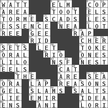 ACROSS 1. Electrical Unit 5. Shade tree 8. Police officer (slang) 11. Type of rug 12. A blast of a horn 14. Raised railways 15. Singer Mel 17. Tons 18. French article 19. Core 21. Teachers' org. 22. Car dealer's back yard 23. To riddle 24. Turn to the right 25. Strike 27. To free from 28. "Mermaids" star 31. Puts into a specified state 35. Allow 37. Casino tip 38. Of the mouth 39. _ de Janeiro 41. Washington bills 42. _ and Stitch 43. Science/research agcy. 45. Egg locale 46. Snakelike fish 47. Feline 49. Definite Article 51. "We ___ not amused" (Victoria) 52. Ocean 55. Mouth or opening 57. Infant locale 60. Thinks logically 62. Set 63. Hits or strikes with great force 65. Table seasonings 66. Untruth 67. Independent ruler or chieftain 68. The main thing one is thinking about 69. Followers of ems 70. Cuckoo 71. Australian parrot (variant) DOWN 1. Wetness 2. Came up 3. Laconic 4. Docile 5. And so on (abbr.) 6. Grant temporary use of 7. Method 8. Portable communications device 9. Margarine 10. Inconspicuous attention getter 13. Russian ruler of old 16. Engineer (abbr.) 17. Sowing specialist 20. To provide with a ceiling 26. 13-14th century defensive garment 29. Supplements with great effort 30. Remainder 31. Flatfish 32. One of the Great Lakes 33. Baron Munchausen's specialties 34. Splash clumsily 36. Shallow baking pan 40. Motion picture awards 44. Conductor's collection 48. Beverages made from leaves 50. Otherwise 52. Twentieth part of a lira 53. Keyboard key 54. Slender Brazilian palm 55. Stare 56. It's straight from the horse's mouth 58. _ mater 59. Ache 61. Move on water 64. Medical imaging device (abbr.)