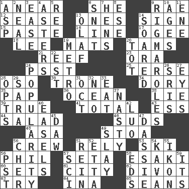 ACROSS 1. Approach 6. A female animal or person 9. Actress Charlotte 12. Gospel singer Marvin 13. Singles 14. Omen 15. Thick mixture 16. Actor's bit 17. Double curve, resembling the letter S 18. Area sheltered from the wind 19. Floor coverings 20. Scottish caps 21. Coral collection 23. Mouth or opening 24. Inconspicuous attention getter 25. Laconic 28. Bear (Spanish) 30. Marketplace scale 34. Small, narrow, flatbottom fishing boat 35. Infant food 36. Sea 38. Whopper 39. Loyal 41. "_____ Recall" 43. Curvy letter 44. First course 46. Beer foam 48. White ___ sheet 49. Portico 50. Ship's personnel 51. Trust 53. What Jean-Claude Killy likes to do 56. Silvers or Donahue 57. Bristle 58. 1973 Nobel Price Winner (Physics) Leo 60. Arranges properly for use 61. Municipality 62. A piece of turf (Scot.) 63. Attempt 64. _ tizzy (2 wds.) 65. Seines DOWN 1. Cleo's killer 2. Anneal 3. Comfort 4. Michaelmas daisies 5. Portuguese money of account (variant) 6. In a ____ (agitated or irritated) 7. Coop moms 8. Compass dir. 9. Complicated, petty procedures 10. Matures 11. Compass dir. 13. Norwegian king 14. Flew 19. Paris' subway 20. Small child 22. Eastern Standard Time (abbr.) 24. Teen's desire 26. Indian titles of respect 27. Snake ____ (dice throw) 28. Elects 29. "Two Mules for Sister ____" 31. Sep. follower 32. Modern: prefix 33. Consume 37. Offensive 40. Artist's stands 42. Nilotic language 45. Obsolete 47. Hyrax 49. Kill 50. "Mermaids" star 51. It's straight from the horse's mouth 52. Singer James 54. Polynesian shrub of the pepper family 55. Picture 56. Pacific Standard Time (abbr.) 57. _-fi 58. Begley and Asner 59. It is