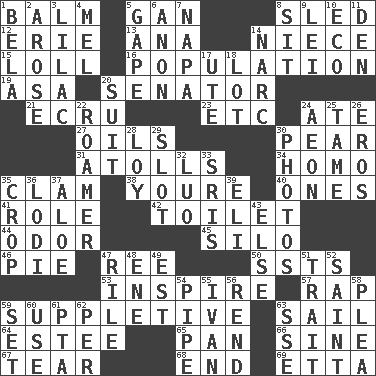 ACROSS 1. Lip ointment 5. Separate the seeds from cotton 8. Downhill vehicle 12. One of the Great Lakes 13. Santa ___, CA 14. Sibling's daughter 15. Hang loosely or laxly 16. Census information 19. White ___ sheet 20. Elected representative 21. Shade of tan 23. And so on (abbr.) 24. Had dinner 27. Lubricates 30. Lightbulb-shaped fruit 31. Ringlike coral islands and reefs 34. Same (prefix) 35. Dollar (slang) 38. You are 40. Singles 41. Hero or heavy, e.g. 42. Bathroom plumbing fixture 44. Scent 45. Grain storage tower 46. Sliced dessert 47. To separate or throw off 50. Fast planes 53. Stimulate to action 57. Reproach for some lapse or misdeed 59. Supplementary 63. Move on water 64. First name in cosmetics 65. Baking dish 66. Trig term 67. Pull apart 68. Conclusion 69. Singer James DOWN 1. Actor Lugosi 2. Came up 3. Pale purple color 4. Cartoonist voice _ Blanc 5. Open wide 6. At once, immediately (arch.) 7. California wine valley 8. Be seated 9. Luau accessory 10. Environmental prefix 11. Lair 14. Drug cop 17. Shoshoni 18. Car dealer's back yard 20. Set or collection 22. Nomad 24. Period of immesurable duration 25. Not wild 26. Greek god of love 28. Myrna of the movies 29. Position in a hierarchy or organization 30. Pictures 32. Nilotic language 33. Indian titles of respect 35. Riding implement 36. Farming town in central California 37. Medicinal plant 39. Connecticut Ivy Leaguer 43. Otherwise 47. Cause heat under the collar 48. Compass dir. 49. Eastern Standard Time (abbr.) 51. Distinguishing feature 52. Inhabitant of Heaven 54. Corncob 55. _ the terrible 56. Tear apart 58. Entreaty 59. Arrange properly for use 60. Purpose 61. Parent Teacher Assoc. 62. For each 63. Compass dir.