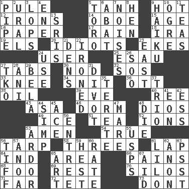 ACROSS 1. Whimper 5. Hyperbolic tangent 9. Being at a high temperature 12. Metal shackles 14. Mitch Miller's instrument 15. Ripen 16. Some stationery 17. Precipitation 18. Lyricist Gershwin 19. Raised railways 20. Foolish or stupid persons 23. Makes supply last 24. One who uses or employs something 25. He sold his birthright 27. Bar bills 30. Dreamland 32. Mayday 33. Leg joint 34. In a ____ (agitated or irritated) 36. Baseball player Mel 38. Petroleum 39. First lady 40. To riddle 43. White ___ sheet 46. Dormintory (informal) 48. "Vaya con ____" 49. Frozen water 51. Beverage made from leaves 52. Charged atoms 53. So be it 54. Loyal 56. Canvas cover 58. Triads 61. Pet locale 64. Indiana (abbr.) 65. Type of rug 66. Aches 68. Egg _ yung 69. Take ten 70. Grain storage towers 71. At a great distance 72. Wig 73. Do not DOWN 1. Corncob 2. Mountain range 3. Chops off 4. Compass dir. 5. "Corrida" creature 6. Blind as ____ 7. Annoying sounds 8. Layer 9. Japanese poetic form 10. Legendary monster 11. Beverages made from leaves 13. Indian titles of respect 21. Lairs 22. Pressed 23. 90 degrees 24. Purpose 26. "Barney Miller" actor Jack 27. Ring climax 28. Black tropical American cuckoo 29. Actor Lugosi 31. A piece of turf (Scot.) 35. Cylindrical with tapered ends 37. Musical group of three 41. A really long time 42. Double-curved letter 44. Simple or foolish person 45. Adept person 47. Female horse 48. Pass on 50. Main course 53. Zeal 55. United States Postal Service (abbr.) 56. Small quarrel 57. Small Philippine buffalo 59. Command 60. Assign a rank or rating to 61. _ and Stitch 62. At once, immediately (arch.) 63. Inconspicuous attention getter 65. Nonscientific branch of learning 67. Help