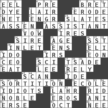 ACROSS 1. Snakelike fish 4. Before (prefix) 7. Cy Young winner Saberhagen 11. Color 12. Den 13. Eat (away) 14. Remaining after all deductions 15. Engineer (abbr.) 16. Chalkboards 17. NE Netherlands city 19. Aide 21. Solemn pledge 23. Angers 24. Beget 25. Mature 26. Fast jet (abbr.) 29. An arm off of a larger body of water 30. Followers of ems 31. Biblical high priest 32. Wedding promise 33. Big collection agency 34. Period of immesurable duration 35. Corporate head (abbr.) 36. _-fi 37. Sadhe (variant) 40. Consume 41. Area sheltered from the wind 42. Depend 43. Examine minutely or intensely 45. Binary compound 46. Casting lots 51. Learning spot: Fr. 55. Foolish or stupid persons 56. Cowardly lion portrayer 58. To free from 59. Having high moral qualities 60. Greek god of love 61. Cuckoo 62. Celtic language 63. Sep. follower 64. Born DOWN 1. Pulitzer Prize-winning author Ferber 2. Sight organs 3. Allows 4. Baking dish 5. Capital of Latvia 6. Blunders 7. Naughty children 8. Roll call or roster of names 9. Genesis locale 10. Trial 12. Poe poem 13. Otherwise 16. Founders of families 18. Tending to cause great harm 20. Omens 22. Soggy 24. Snob 25. Nest on high 26. Morally degraded 27. _ gin 28. Metal container 29. It may be bright or harebrained 32. Frozen water 33. Ancient Celtic tribe of eastern Britain 36. Narrow boards 37. Three (prefix) 38. Spring feasts 39. Actor Baldwin 43. Took without asking 44. Quote 46. Trig term 47. Scent 48. Teases 49. Margarine 50. Drug cop 52. NW Algerian seaport 53. Actor's bit 54. Singer Brickell 57. Being at a high temperature
