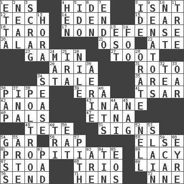 ACROSS 1. Followers of ems 4. Flintstone garb 8. Is not 12. Technology 14. Paradise 15. Letter starter 16. Pacific island yam 17. Unrelated to defense, as in spending 20. Having or resembling wings 21. Bear (Spanish) 22. Had dinner 23. Homeless child 27. A blast of a horn 29. Operatic vocal solo 31. Printing process, for short 34. Lacking originality or spontaneity 35. Length times width 36. Corncob 39. Period 41. Russian ruler of old 42. Small Philippine buffalo 43. Lacking in sense or substance 46. Friends 47. Inactive volcano in Sicily 48. Wig 51. Signals 54. Slender fish 56. Reproach for some lapse or misdeed 58. Otherwise 61. Conciliate 66. Made of lace 67. Portico 68. Musical group of three 69. One who doesn't tell the truth 70. Post 71. Coop moms 72. Compass dir. DOWN 1. Singer James 2. Anneal 3. Strangle with an iron collar 4. Layer 5. Wedding promise 6. Lair 7. Inside; within (prefix) 8. Binary compound 9. Elected representatives 10. Political cartoonist Thomas 11. Family _ (genealogy) 13. Israeli folk dance 18. Eastern Standard Time (abbr.) 19. Egg _ yung 24. Floor covering 25. Retirement account (abbr.) 26. "Death on the ____" 28. Speak pompously 30. Nest on high 32. Beverage made from leaves 33. Boat paddle 34. Gospel singer Marvin 36. Infant food 37. _ tizzy (2 wds.) 38. Coward 40. Pismires 44. Black tropical American cuckoo 45. Tired old horse 49. Three (prefix) 50. Consume 52. 1994 drama film starring Jodie Foster 53. Killed 54. Global Positioning Systems (abbr.) 55. Johnson of "Laugh-In" 57. Heart or essence 59. Glance over 60. Jane of fiction 62. Groovy apt. 63. "We ___ not amused" (Victoria) 64. Shallow baking pan 65. Greek goddess of the dawn