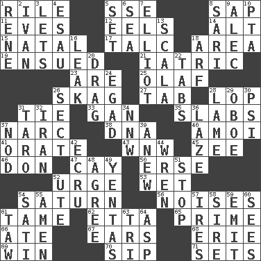 ACROSS 1. Cause heat under the collar 5. Compass dir. 8. Plant excrement 11. Nights before holidays 12. Snakelike fish 14. The first octave above the treble staff 15. Relating to or accompanying birth 17. Baby powder 18. Type of rug 19. Took place subsequently 21. Of or pertaining to medicine 23. "We ___ not amused" (Victoria) 25. Norwegian king 26. Heroin 27. Bar bill 28. Chop off 31. Standoff 33. Separate the seeds from cotton 35. Thick slices 37. Drug cop 38. Heredity factor (abbr.) 40. Mine, in Marseilles 41. Declaim 43. Compass dir. 45. Last letter of the English alphabet 46. Spanish title 47. Island 50. Celtic language 52. Goad 53. Soggy 54. Titan orbits this 56. Annoying sounds 61. Not wild 62. Singer James 65. A-one 66. Had dinner 67. Hearing organs 68. One of the Great Lakes 69. Acquire through effort 70. Small drink 71. Puts into a specified state DOWN 1. French philosopher Descartes 2. _ the terrible 3. Allows 4. Son of Isaac 5. Arrange properly for use 6. Ocean 7. American author Paul (1891-1958) 8. Indian skirt 9. Actor Baldwin 10. Parent Teacher Assoc. 13. Any of the three canals of the cochlea 16. Path through which fluid escapes 18. Sandy's bark 20. To trail on the ground 22. Bar bills 24. Mild oath 26. Religious group 28. Unable to walk 29. Mitch Miller's instrument 30. Air pressure measure (abbr.) 31. Edible starchy tuberous root 32. SW Asia republic 34. Compass dir. 36. Goldbrick 37. Lower and raise head in agreement 39. Afresh 42. Shade of tan 44. Songbird 48. Match 49. Gossips 51. Cease 52. Shoshoni 54. Suttee (variant) 55. So be it 57. Angers 58. Beget 59. Send forth 60. Perceives with the eye 61. The 23rd letter of the Hebrew alphabet 63. Three (prefix) 64. Cleo's killer