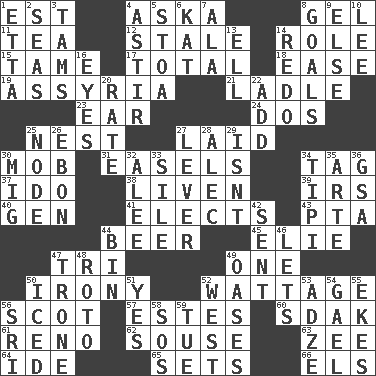 ACROSS 1. Eastern Standard Time (abbr.) 4. "____ silly question..." 8. Set 11. Afternoon social gathering 12. Lacking originality or spontaneity 14. Hero or heavy, e.g. 15. Not wild 17. Add up to 18. Relaxation 19. Nineveh was its capital 21. Dipping utensil 23. Hearing organ 24. Two (Sp.) 25. Egg locale 27. Put down 30. Disorderly crowd 31. Artist's stands 34. Label 37. Wedding promise 38. Make or become more lively 39. Big collection agency 40. Commissioned mil. rank 41. Chooses 43. Parent Teacher Association (abbr.) 44. Fermented drink made from hops 45. Writer Wiesel 47. Three (prefix) 49. Single 50. Literary sarcasm 52. Electrical Measurement 56. Native of Scotland 57. _____ Park, CO 60. Neighbor of Neb. 61. Former U.S. Attorney General Janet 62. Boozer 63. Last letter of the English alphabet 64. Binary compound 65. Arranges properly for use 66. Raised railways DOWN 1. Singer James 2. Oceans 3. Scottish caps 4. Moving about 5. Portico 6. Krazy ___ of comics 7. In the manner of 8. Scores awarded for successful feats 9. Otherwise 10. Area sheltered from the wind 13. Pipe bend 14. Do over again 16. Sight organs 20. Assign a rank or rating to 22. Find the sum of 25. Connecting point 26. Inky black, to poets 27. Prying instrument 28. Actor Baldwin 29. Is not 30. Russian fighter aircraft 32. Toward shelter 33. Filth; sediment 34. Native american tent (variation) 35. Johnson of "Laugh-In" 36. Girls' org. (abbr.) 42. Emitted 44. Storage container 46. Allows 47. Marketplace scale 48. Printing process, for short 49. Fertile tracts in a desert 50. On the rocks 51. Consenting reply 52. 270 degrees 53. Axlike tool, used for shaping wood 54. Highlander 55. Makes supply last 56. Indian title of respect (Mr.) 58. Mayday 59. Third day of the wk.