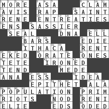 ACROSS 1. Greater amount 5. White ___ sheet 8. Dollar (slang) 12. Opinion 13. Strike 14. Virtuous person 15. French philosopher Descartes 16. Pleas 19. Followers of ems 20. More impudent 21. Lick closed 23. Heredity factor (abbr.) 24. Pipe bend 27. Long, evenly shaped pieces 30. Singer Brickell 31. New York city 34. Monthly bill 35. Supplemented with great effort 38. Declaim 40. Singles 41. False hair 42. Pressed 44. Be inclined (to) 45. Ancient Persian 46. Santa ___, CA 47. Double-curved letter 50. The content of cognition 53. Curse 57. According to 59. Census information 63. Demure 64. Disturbances 65. Allow head to fall sleepily 66. Painter Guido (1575-1642) 67. Writer Wiesel 68. Begley and Asner 69. Wrote a lyric poem DOWN 1. Female horse 2. Baking chambers 3. Remove soap 4. Compass dir. 5. Length times width 6. Without 7. Flats, for short 8. Feline 9. Cards in a Roman deck? 10. One (Scot) 11. Mountains (abbr.) 14. "Two Mules for Sister ____" 17. To free from 18. Car or cant ending 20. Narrow board 22. Remained 24. Genesis locale 25. Actor's bit 26. Allows 28. 17th letter of the Greek alphabet 29. Indian skirt 30. Worn away 32. 4-wheeled motor vehicle 33. Smallest unit of an element 35. Singer James 36. Peachy ____! 37. Inactive volcano in Sicily 39. Compass dir. 43. Prepare for publication 47. Snakelike fish 48. Health resort 49. Be seated 51. Having ears or earlike features 52. Place in a line 54. Prong on a fork 55. Parka part 56. Conclusions 58. Among 59. Before (prefix) 60. Lubricate 61. Luau course 62. Shoshoni 63. Adept person