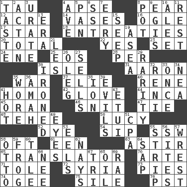 ACROSS 1. The 19th letter of the Greek alphabet 4. Domed church section 8. Lightbulb-shaped fruit 12. Measure of real estate 14. Flower holders 16. Stare at amorously 17. Play the lead 18. Pleas 20. "_____ Recall" 22. It is so 23. Arrange properly for use 24. Compass dir. 25. Greek goddess of the dawn 28. For each 30. Capri or Wight 31. Composer Copland 35. Armed conflict 37. Writer Wiesel 40. French philosopher Descartes 41. Like (prefix) 42. Michael Jackson trademark 44. South American Indian 45. NW Algerian seaport 46. In a ____ (agitated or irritated) 47. Standoff 48. Giggle 50. "I Love _" 52. Color 54. Small drink 55. Compass dir. 58. Often (poetically) 61. Car or cant ending 63. Moving or stirring 65. Interpreter 70. Johnson of "Laugh-In" 71. Lacquered or enameled metalware 72. Damascus' land 73. Sliced desserts 74. Double curve, resembling the letter S 75. Filth; sediment 76. Pacific Standard Time (abbr.) DOWN 1. Clothes sense 2. Gambison 3. A salt of uric acid 4. "___ Maria" 5. Baking dish 6. Fast jet (abbr.) 7. Suggestive of the supernatural 8. Plant holder 9. The front part of a cuirass 10. Toward shelter 11. Respite 13. Period 15. Ooze 19. At sea 21. French article 26. Cassini of fashion 27. Makes a sale 29. Noteworthy scarcity 30. Pressed 32. Painter Guido (1575-1642) 33. At one time in the past 34. Teachers' org. 35. Had on 36. Nursemaid 38. Electrically charged atom 39. Vices 41. Being at a high temperature 43. Needle holder 49. Sight organs 51. Accounting whiz (abbr.) 53. Snakelike fish 55. Remove all contents or possession from 56. Settings 57. Obtain by seizing forcibly or violently 58. Von Bismarck 59. Toadlike animal 60. Falsehood 62. Negative votes 64. Plant excrement 66. Born 67. Three (prefix) 68. Lubricate 69. Actress Charlotte