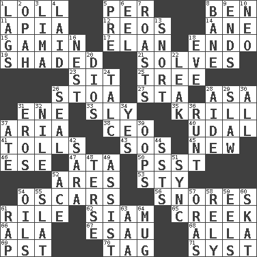 ACROSS 1. Hang loosely or laxly 5. For each 8. Benjamin's nick name 11. Capital of Western Samoa 12. Vintage cars 14. A saturated hydrocarbon 15. Homeless child 17. Flair 18. Inside; within (prefix) 19. Cast a shadow over 21. Finds the solution 23. Be seated 25. Woody plant 26. Portico 27. R.R. building 28. White ___ sheet 31. Compass dir. 33. Secret 35. Shrimp-like planktonic crustaceans 37. Operatic vocal solo 38. Corporate head (abbr.) 40. Hereditary estate 41. For Whom the Bell _____ 43. Distress signal 45. ___ Haven, CT 46. Compass dir. 47. "One Day ___ Time" 50. Inconspicuous attention getter 52. Ancient Greek god of war 53. Filthy place 54. Motion picture awards 56. Sounds asleep 61. Cause heat under the collar 62. Thailand, formerly 65. Small stream 66. According to 67. He sold his birthright 68. Silent film actress Nazimova 69. Pacific Standard Time (abbr.) 70. Label 71. System (abbr.) DOWN 1. Fails to keep up a pace 2. Brightly colored fish 3. Pale green bean 4. Put down 5. Before (prefix) 6. Snakelike fish 7. Exposes to great heat 8. Object of repulsion 9. Extremities 10. Modern: prefix 13. Derisive sound 16. A home for chicks 18. Night before a holiday 20. "Vaya con ____" 22. Path through which fluid escapes 24. Baby powder 26. Lick closed 28. Assistant 29. Cole _ (cabbage dish) 30. 100% 31. Greek god of love 32. The longest river in the world 34. Affirmative reply 36. The smallest animal of a litter 37. Had dinner 39. I made a mistake 42. "Two Mules for Sister ____" 44. Fast planes 48. Laconic 49. Aid 51. Synchronize (abbr.) 52. Adept person 54. Lubricates 55. Narrow board 57. Mouths or openings 58. Have trust in 59. Snakelike fish 60. Three-handed card game 61. Strike 63. American Automobile Association (abbr.) 64. Large cup
