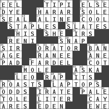 ACROSS 1. Snakelike fish 4. Native american tent (variation) 8. Otherwise 12. Color 13. Ethiopian city, capital of Harari 14. Flatfish 15. Lick closed 17. Place in a line 18. Calm and collected 19. Paper fasteners 21. Chalkboards 23. Part of HMS, perhaps 24. A female animal or person 26. Big collection agency 27. Painter Guido (1575-1642) 28. Fastener 30. Title for a knight 31. Speaker 34. Bar 37. Grow older 38. The wife of a rajah (variant) 39. One (Scot) 40. Writing tablet 41. Bundle 42. Small bed 43. Undercover agent 44. "____ silly question..." 46. Lion 47. Strike 50. ___ a Wonderful Life 51. Cooks with dry heat, as in an oven 54. Portable computers 57. Probability 58. Feeling or showing extreme anger 60. Diluted with white 62. Lacquered or enameled metalware 63. 61 cubic inches 64. Island 65. Ancient Greek god of war 66. Paradise 67. She-sheep DOWN 1. Begley and Asner 2. Sight organs 3. Tough but pliablecoriaceous 4. Falsehoods 5. From or relating to Ireland 6. Baking dish 7. Angers 8. Fortification 9. Plunders 10. _ gin 11. Snakelike fish 13. Actor Linden 16. (Had) reclined 20. Air pressure measure (abbr.) 22. One who doesn't tell the truth 25. First name in cosmetics 27. Capital of Latvia 29. Christmas carol 30. Plant excrement 31. Of the mouth 32. More valued for its uncommonness 33. Added to 34. Keyboard key 35. Small Philippine buffalo 36. Fish or hair follower 41. Pick up the tab 43. Makes clutter 44. Small island 45. Constrict 46. Dipping utensil 48. Having winglike extensions 49. Eucharist need 51. Round or rotation of duties 52. Scent 53. Drop; flow; fall 55. For each 56. Cole _ (cabbage dish) 59. To free from 61. Sight organ