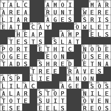 ACROSS 1. Baby powder 5. Mine, in Marseilles 9. Make imperfect 12. Length times width 13. The smallest animal of a litter 14. Past tense of be (plural) 15. One who doesn't tell the truth 16. Eons 17. Indian titles of respect 18. Erode 19. Island 21. A small or young owl 22. Pile 24. Electrical Unit 26. Raised railways 27. Trials 28. Narrow board 29. Left side of a ship or aircraft 30. Value system 32. Connecting point 36. Double curve, resembling the letter S 37. Period of immesurable duration 38. One who makes use of a thing 39. Bits 40. Tear up 42. Inactive volcano in Sicily 43. Family _ (genealogy) 44. All-night dance parties 46. Cleo's killer 49. Whopper 50. At once, immediately (arch.) 51. Pale purple color 53. Ripen 54. Mayday 57. Having or resembling wings 58. Obstruct or block passage 61. "Death on the ____" 62. Carryall 63. Costume for a special activity 64. Baking chamber 65. Compass dir. 66. Snakelike fish 67. Vintage cars DOWN 1. Lie 2. Operatic vocal solo 3. Tough but pliablecoriaceous 4. 4-wheeled motor vehicle 5. Like ___ of sunshine 6. Java container 7. Single 8. ___ a Wonderful Life 9. Haggard of country music 10. Satellite of Uranus 11. Musical pauses 14. Compass dir. 19. Domesticated feline 20. Domed church section 21. Choose 23. _____ Park, CO 24. Place in a line 25. Apple computer (short form) 27. Ancient Roman robe 28. Dinah or Pauly 29. Cooking vessel 31. Giggle 32. New (sp.) 33. Clearly or manifestly demonstrative 34. Habitations of wild animals 35. Epoch 40. Indian title of respect (Mr.) 41. To trail on the ground 43. Affectionate concern, for short 45. A saturated hydrocarbon 46. Having winglike extensions 47. Grain storage towers 48. Food holder 52. "We ___ not amused" (Victoria) 53. Tenement units (abbr.) 55. Butter sub 56. Elected reps. 58. Compass dir. 59. Third day of the wk. 60. Lubricate 61. And not