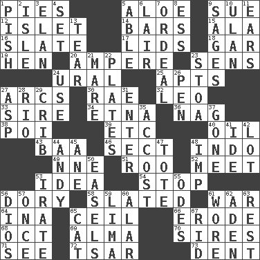 ACROSS 1. Sliced desserts 5. Medicinal plant 9. Institute legal proceedings 12. Small island 14. Long, evenly shaped pieces 15. According to 16. Schedule 17. Hats (slang) 18. Slender fish 19. Layer 20. Electrical Unit 23. Elected reps. 24. Mountain range 25. Tenement units (abbr.) 27. Curves 30. Actress Charlotte 32. Lion 33. Title for a man of rank and authority 34. Inactive volcano in Sicily 36. Tired old horse 38. Luau course 39. And so on (abbr.) 40. Lubricate 43. Sound made by sheep 46. Religious group 48. Southeast Asian peninsula 49. Compass dir. 51. Friend of Pooh 52. Confront 53. It may be bright or harebrained 54. Discontinue 56. Small, narrow, flatbottom fishing boat 58. Scheduled 61. Armed conflict 64. _ tizzy (2 wds.) 65. To provide with a ceiling 66. Eat (away) 68. Sep. follower 69. _ mater 70. Titles for men of rank and authority 71. Perceive with the eye 72. Russian ruler of old 73. Gouge DOWN 1. Expression of disdain 2. Capri or Wight 3. Enthusiasm 4. Arrange properly for use 5. Competent 6. Den 7. Severe or trying experience 8. Curvy letter 9. Gurus 10. Uhlan (variant) 11. Hearing organs 13. Rend 21. Female horse 22. Food holders 23. Portico 24. Purpose 26. Fenced enclosure 27. Cleo's killer 28. River (Sp.) 29. Baby bed with high sides 31. Keyboard key 35. Buttonhole 37. Went 41. Binary compound 42. Car dealer's back yard 44. "60 Minutes" Commentator Rooney 45. A saturated hydrocarbon 47. Carry 48. Naughty child 50. Artist's stands 53. Feeling or showing extreme anger 55. Lyric poems 56. "Vaya con ____" 57. Single time 59. Pale green bean 60. Having or resembling wings 61. Had on 62. An important port of Yemen 63. Take ten 65. Domesticated feline 67. To free from