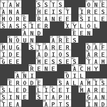 ACROSS 1. The 23rd letter of the Hebrew alphabet 4. Fast planes 8. Single 11. Santa ___, CA 12. Robbery 14. Angers 15. Greater amount 17. Indian princess (variant) 18. Filth; sediment 19. More impudent 21. Xylene (variant) 23. Also 24. Car or cant ending 25. Part of speech 27. Ancient Greek god of war 30. Java container 31. A viewer who gazes fixedly 34. Clumsy lout 37. Binary compound 38. Goodbye (Sp.) 39. "We ___ not amused" (Victoria) 40. Unit of force equal to gravity 41. Makes clutter 43. Scottish cap 44. French philosopher Descartes 45. Painful 47. Cuckoo 49. Lubricate 50. Eat (away) 52. Deli grouping 56. Downhill vehicle 57. It is permitted: Lat. 60. Female horse 61. Trig term 62. Staphylococcus 63. Separate the seeds from cotton 64. Afternoon social gathering 65. Tenement units (abbr.) 66. Working for oneself (abbr.) DOWN 1. Scottish caps 2. Small Philippine buffalo 3. Armed conflicts 4. Fragment 5. Burn superficially 6. Shallow baking pan 7. Compass dir. 8. Constellation of myth 9. 1994 drama film starring Jodie Foster 10. Compass dir. 13. John Ritter's dad 14. Capri or Wight 16. Son of Isaac 20. Taverns 22. It is so 25. Naked 26. Double curve, resembling the letter S 27. Ascend 28. Vintage cars 29. Celtic language 30. Russian fighter aircraft 32. Docile 33. An important port of Yemen 34. Pledge 35. Like ___ of sunshine 36. Opposite of masc. 42. Travel by water 44. To free from 46. Dollar (slang) 47. Sports stadium 48. Connecting point 49. Expletives 50. Writer Wiesel 51. Raised railways 52. Back-to-school mo. 53. Wise men 54. SW Asia republic 55. Transmit 56. Fast jet (abbr.) 58. Call ___ day 59. Head covering