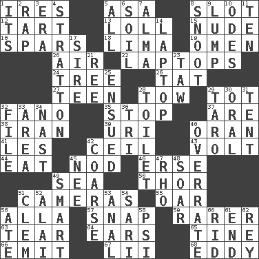 ACROSS 1. Angers 5. White ___ sheet 8. Position in a hierarchy or organization 12. Small pie 13. Hang loosely or laxly 15. Unadorned 16. Practice fights 18. Pale green bean 19. Sign of something about to happen 20. Atmosphere 22. Portable computers 24. Relationship diagram 26. Make lace 27. Adolescent 28. Pull behind 29. Small child 32. Papal veil 35. Cease 37. "We ___ not amused" (Victoria) 38. SW Asia republic 39. RI univ. 40. Northwest Algerian city 41. French article 42. To provide with a ceiling 43. Electrical Unit 44. Ingest 45. Lower and raise head in agreement 46. Celtic language 49. Ocean 50. Son of Odin 51. Devices for capturing images 55. Boat paddle 56. Silent film actress Nazimova 57. Fastener 59. More valued for its uncommonness 63. Rend 64. Hearing organs 65. Prong on a fork 66. Give off 67. Cards in a Roman deck? 68. Whirlpool DOWN 1. ___ a Wonderful Life 2. Strike 3. Epoch 4. Ski resort town in Vermont 5. 100% 6. The visible part of the earth's surface 7. _ mater 8. Snout, nose 9. Mass 10. Lyric poems 11. "___ Little Indians" 14. Portable computer 17. Beget 21. To sift 23. The 23rd letter of the Hebrew alphabet 25. Took place subsequently 28. Bathroom 29. Pacific island yam 30. Of the mouth 31. Portable shelter 32. Do some clerical work 33. Type of rug 34. Political cartoonist Thomas 36. Three (prefix) 40. Make much ado about nothing 42. Unrefined 45. Born 47. 17th letter of the Greek alphabet 48. Fly high 49. Don Adams' spy role 51. Clement's nick name 52. Mountain range southwest of Kyrgyzstan 53. Of or related to the anus 54. Indian skirt 56. Had dinner 58. 23rd letter of the Greek alphabet 60. To free from 61. Conclusion 62. Marina Del _, California