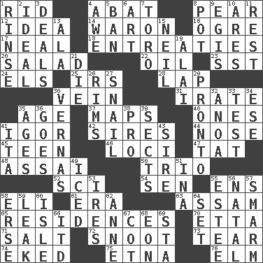 ACROSS 1. To free from 4. Blind as ____ 8. Lightbulb-shaped fruit 12. The content of cognition 14. Make _____ (do battle with) 16. Legendary monster 17. Be tempered by heat 18. Pleas 20. First course 22. Petroleum 23. Fast jet (abbr.) 24. Raised railways 25. Big collection agency 28. Infant locale 30. Distinctive style or manner 31. Feeling or showing extreme anger 35. Ripen 37. Atlas contents 40. Washington bills 41. Composer Stravinsky 42. Begets 44. Sense of smell 45. Adolescent 46. Locales 47. Make lace 48. Slender Brazilian palm 50. Musical group of three 52. _-fi 54. Elected rep. 55. Followers of ems 58. Connecticut Ivy Leaguer 61. Period 63. Indian state 65. Homes 70. Singer James 71. Table seasoning 72. Snout, nose 73. Lacerate 74. Supplemented with great effort 75. Inactive volcano in Sicily 76. Shade tree DOWN 1. Wash lightly 2. Standard of perfection 3. Allots cards 4. Deep reverence 5. Prohibit 6. Nonscientific branch of learning 7. "Corrida" creature 8. Cooking vessel 9. Armor plate that protects the chest 10. Ancient Greek god of war 11. Take ten 13. Wing 15. Famous astronaut Armstrong 19. Jai ____ 21. Pass on 26. Basketball hoops 27. Slow-paced one 29. Right away 30. Actresses Bloom and Felton 32. Small Philippine buffalo 33. Trial 34. Compass dir. 35. Eons 36. Moves 38. Adept person 39. Religious groups 41. Call ___ day 43. Title for a man of rank and authority 49. On the rocks 51. _ tizzy (2 wds.) 53. Angers 55. First name in cosmetics 56. Relating to or accompanying birth 57. Excessive but superficial compliments 58. Celtic language 59. Path through which fluid escapes 60. Capri or Wight 62. Singer Murray 64. Arrange properly for use 66. It would 67. Small bed 68. Period of immesurable duration 69. R.R. building