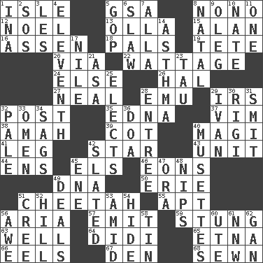ACROSS 1. Small island 5. Girls' org. (abbr.) 8. Words to Nanette 12. Christmas carol 13. Spanish pot 15. ____ Jay Lerner 16. NE Netherlands city 18. Friends 19. False hair 20. By way of 22. Electrical Measurement 24. Otherwise 26. Actor Linden 27. Actress Patricia 28. Australian flightless bird 29. Big collection agency 32. Mail 35. Pulitzer Prize-winning author Ferber 37. Zeal 38. Nursemaid 39. Small bed 40. Wise men 41. Part of a journey 42. Play the lead 43. A single undivided whole 44. Followers of ems 45. Raised railways 46. Immeasurably long periods of time 49. Heredity factor (abbr.) 50. One of the Great Lakes 51. Leopard's kin 55. Fitting 56. Roberta Peters solo 57. Give off 59. Feeling sharp psychological pain 63. Water source 64. "You Light Up My Life" star Conn 65. Inactive volcano in Sicily 66. Snakelike fish 67. Lair 68. Stitched DOWN 1. _ tizzy (2 wds.) 2. Distress signal 3. French article 4. Veterans Day date 5. Republican Party 6. Cole _ (cabbage dish) 7. Silent film actress Nazimova 8. Brizilian seaport 9. Cassini of fashion 10. Nathan's nickname 11. Single 14. Respiratory problem 17. "Death on the ____" 21. White ___ sheet 23. The 19th letter of the Greek alphabet 25. Opts 28. Main course 29. _ the terrible 30. Swiss mountan, "Queen of the Mountains" 31. Stricken, poetically 32. Light colored 33. Sign of something about to happen 34. Settles 36. ___ good deed 40. French bagpipes 42. Scheduled 45. Compass dir. 47. Mouth or opening 48. Cuts off 49. Allots cards 51. Algonquian 52. Land elevation 53. Among 54. Flintstone garb 56. Deep reverence 58. Metal container 60. Shoshoni 61. Compass dir. 62. Separate the seeds from cotton