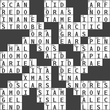 ACROSS 1. Skim 5. Hat (slang) 8. Sandy's bark 11. Make new 12. Mouths or openings 14. And not 15. Silly 17. Not wild 18. "Tell ____ the Marines!" 19. Disco prop 21. Northern region 23. Mouth or opening 25. Pate de foie ____ 26. Soon (poet.) 27. Ewer handle 28. Writing instrument 31. Actor Linden 33. Mayday 35. Sadhe (variant) 37. Same (prefix) 38. Help 40. Capital of Western Samoa 41. Satellite of Uranus 43. To free from 45. Actress Charlotte 46. Male parent 47. Call ___ day 50. Tenth: prefix 52. Dec. holiday 53. _ tizzy (2 wds.) 54. Motion picture awards 56. Sounds asleep 61. Mine, in Marseilles 62. Thailand, formerly 65. Collection of objects 66. Set 67. Small island 68. Actor Baldwin 69. Conclude 70. Make lace 71. For fear that DOWN 1. Indian titles of respect 2. Penny 3. The sixth month of the Jewish calendar 4. Words to Nanette 5. Car dealer's back yard 6. Lyricist Gershwin 7. Break 8. Opposed to 9. College mil. group 10. Back 13. Spanish missionary in California 16. Inky black, to poets 18. It is 20. Greek god of love 22. Draw slowly or heavily 24. Small Philippine buffalo 26. Medicinal plant 28. Dad 29. Singer Brickell 30. Teachers' org. 31. Israeli folk dance 32. Among 34. Title for a knight 36. Indian skirt 37. Possessed 39. "You Light Up My Life" star Conn 42. Pale green bean 44. Cub Scout units 48. Tarsus (plural) 49. Help 51. Patter 52. One more than ninety 54. Sign of things to come 55. Disposed of to a purchaser 57. Relating to the mouth 58. Hero or heavy, e.g. 59. Nights before holidays 60. Religious group 61. Personal question 63. According to 64. Was introduced to