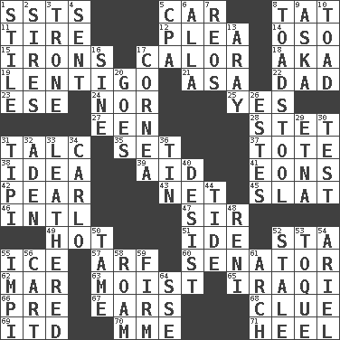 ACROSS 1. Fast planes 5. 4-wheeled motor vehicle 8. Make lace 11. Hoop that covers a wheel 12. Entreaty 14. Bear (Spanish) 15. Removes the wrinkles 17. Bodily heat indicating an inflammation 18. Alias (abbr.) 19. Small, flat, pigmented spot on the skin 21. White ___ sheet 22. Male parent 23. Compass dir. 24. And not 25. Consenting reply 27. Car or cant ending 28. Proofreading order 31. Baby powder 35. Put into a specified state 37. Carry 38. The main thing one is thinking about 39. Help 41. Immeasurably long periods of time 42. Lightbulb-shaped fruit 43. Fish or hair follower 45. Narrow board 46. International (abbr.) 47. Title for a knight 49. Being at a high temperature 51. Binary compound 52. R.R. building 55. Frozen water 57. Sandy's bark 60. Elected representative 62. Spoil 63. Wet 65. Resident of Iraq 66. Before (prefix) 67. Hearing organs 68. A slight indication 69. It would 70. Madame (abbr.) 71. The bottom of a shoe or boot DOWN 1. Vertical member of a panel or frame 2. Fathers 3. Heavy duty weighing machine 4. Transmitted 5. Accounting whiz (abbr.) 6. Silent film actress Nazimova 7. Vintage cars 8. Inedible or poisonous agaric 9. "____ silly question..." 10. Frog relative 13. Like ___ of sunshine 16. Trig term 17. Pupil covering 20. Leaves 26. _____ Park, CO 29. Inactive volcano in Sicily 30. Trial 31. Native american tent (variation) 32. An important port of Yemen 33. Resembling or made to resemble leather 34. Monte _, Las Vegas Hotel/Casino 36. Shallow baking pan 40. Cease 44. Event that recurs at intervals 48. Painter Guido (1575-1642) 50. Docile 52. Having lost freshness 53. Woman's close-fitting hat 54. Satellite of Uranus 55. Body of Kaffir warriors 56. Draw slowly or heavily 58. Wander aimlessly 59. Not soft or yielding to pressure 61. Bowlike part 64. Compass dir.