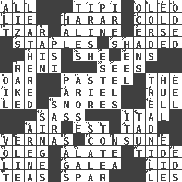 ACROSS 1. Everything 4. Native american tent (variation) 8. Margarine 12. Falsehood 13. Ethiopian city, capital of Harari 14. Lacking warmth 15. Czar 17. Place in a line 18. Celtic language 19. Paper fasteners 21. Cast a shadow over 23. Part of HMS, perhaps 24. A female animal or person 26. Followers of ems 27. Painter Guido (1575-1642) 28. Perceives with the eye 30. Boat paddle 31. Soft color 34. Definite Article 37. Mamie's mate 38. Satellite of Uranus 39. Regret 40. Directed 41. Sounds asleep 42. Pipe bend 43. Backtalk 44. Slanted text style (abbr.) 46. Wind 47. Eastern Standard Time (abbr.) 50. Bit 51. Actresses Bloom and Felton 54. Ingest 57. Cassini of fashion 58. Having winglike extensions 60. Event that recurs at intervals 62. Actor's bit 63. An organ shaped like a helmet 64. Hat (slang) 65. Beverages made from leaves 66. Coast Guard woman 67. French article DOWN 1. The first octave above the treble staff 2. Belonging to Elizabeth 3. Resembling or made to resemble leather 4. Lies 5. From or relating to Ireland 6. Baking dish 7. Angers 8. Seas 9. Domineers 10. Otherwise 11. Wrote a lyric poem 13. Actor Linden 16. Precipitation 20. 23rd letter of the Greek alphabet 22. The bottom of a shoe or boot 25. First name in cosmetics 27. Libertine 29. Snakelike fish 30. Lubricate 31. Zero-star reviews 32. Came up 33. Title for a knight 34. Excercise machine 35. Frame or body of a ship 36. Snakelike fish 41. "Two Mules for Sister ____" 43. Scorches 44. ___ a Wonderful Life 45. Drawn tight 46. Sports stadium 48. Any of the three canals of the cochlea 49. Carrier 51. Electrical Unit 52. Writer Wiesel 53. Droops 55. Teachers' org. 56. Singer Brickell 59. Infant locale 61. Begley and Asner