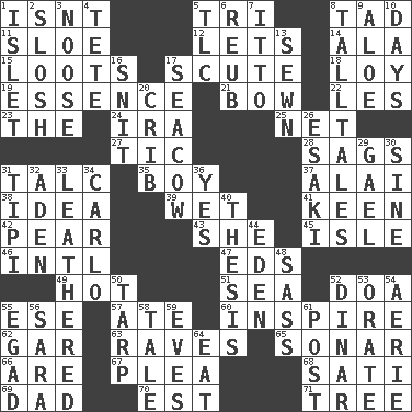 ACROSS 1. Is not 5. Three (prefix) 8. Small amount or degree 11. A type of plum 12. Allows 14. Chicken ___ king 15. Plunders 17. Scutum 18. Myrna of the movies 19. Gist 21. Arrow shooter 22. French article 23. Definite Article 24. Lyricist Gershwin 25. Remaining after all deductions 27. Nervous spasm 28. Droops 31. Baby powder 35. Male child 37. Jai ____ 38. It may be bright or harebrained 39. Dripping 41. Peachy ____! 42. Lightbulb-shaped fruit 43. A female animal or person 45. Capri or Wight 46. International (abbr.) 47. Begley and Asner 49. Being at a high temperature 51. Ocean 52. ___ good deed 55. Compass dir. 57. Had dinner 60. Heighten or intensify 62. Slender fish 63. All-night dance parties 65. Underwater navigation system 66. "We ___ not amused" (Victoria) 67. Entreaty 68. Suttee (variant) 69. Male parent 70. Eastern Standard Time (abbr.) 71. Relationship diagram DOWN 1. Small island 2. Make a splashing sound 3. Trap for birds or small mammals 4. False hair 5. Affectionate concern, for short 6. Reuben's nickname 7. "Tell ____ the Marines!" 8. Baron Munchausen's specialties 9. Medicinal plant 10. 24-hour periods 13. Stitched 16. In a ____ (agitated or irritated) 17. Manatee 20. Baby bed with high sides 26. 1973 Nobel Price Winner (Physics) Leo 29. Highlander 30. Trig term 31. Native american tent (variation) 32. An important port of Yemen 33. Resembling or made to resemble leather 34. Monte _, Las Vegas Hotel/Casino 36. Consenting reply 40. College paper 44. Paradise 48. Backtalk 50. Canvas cover 52. Middle Eastern gold or silver currency 53. Speak pompously 54. Nest on high 55. Mild oath 56. "Two Mules for Sister ____" 58. Falsehood 59. Nights before holidays 61. Mail 64. Erode