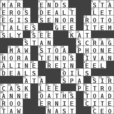 ACROSS 1. Make imperfect 4. Conclusions 8. R.R. building 11. Greek god of love 13. Started a card game 15. Allow 16. The front part of a cuirass 17. Sir (Sp.) 18. Printing process, for short 19. Stories 21. Turn to the right 22. A whole individual unit 23. Secret 24. Perceive with the eye 27. Krazy ___ of comics 29. Comedian Laurel of Laurel & Hardy 30. Strangle with an iron collar 34. Informal term for the mouth 36. Portico 39. Give a jingle 40. Israeli folk dance 41. Is inclined (to) 43. "Terrible" tsar 44. Place in a line 46. It's straight from the horse's mouth 47. Snakelike fish 48. Allots cards 49. Petroleums 51. _ moment's notice (2 wds.) 53. Health resort 54. Title for a knight 57. Keg 60. Area sheltered from the wind 63. Stone: prefix 65. Queen of England 1702-14 66. Curses 69. Frog relative 70. Friend of Pooh 71. Bert's buddy 72. Quote 73. The 23rd letter of the Hebrew alphabet 74. Political cartoonist Thomas 75. Corporate head (abbr.) DOWN 1. Confronts 2. Therefore, facetiously 3. Agitated, as a liquid 4. Begley and Asner 5. Born 6. Mild oath, euphamism for damn 7. _ gin 8. Position in a hierarchy or organization 9. Wig 10. Tiny particle 12. Compass dir. 14. Long journey 18. Actors Guy, Robert Welles, and Clint 20. Fast jet (abbr.) 25. 90 degrees 26. Keyboard key 28. Viper 29. Tchaikovsky ballet 31. Be footloose 32. Of or related to the anus 33. Commissioned military rank (abbr.) 34. Undercover agent 35. Operatic vocal solo 37. Single 38. Goodbye (Sp.) 40. Possessed 42. Clip 45. Eastern Standard Time (abbr.) 50. Infant locale 52. _ vera 54. Unemotional 55. Feeling or showing extreme anger 56. Cowboy competition 57. Draw slowly or heavily 58. Small Philippine buffalo 59. Frozen precipitation 61. Merit 62. Inactive volcano in Sicily 64. And so on (abbr.) 67. Part of HMS, perhaps 68. Arrange properly for use