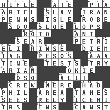 ACROSS 1. Ransack; plunder; pillage 6. Had dinner 9. Parent Teacher Association (abbr.) 12. Satellite of Uranus 13. Kill 14. SW Asia republic 15. Actor Sean's family 16. Small island 17. Loose flowing garment 18. "Barney Miller" actor Jack 19. _ gin 20. Chops off 21. Printing process, for short 23. Cuckoo 24. Singe 25. _ dish (used to culture cells) 28. Biblical high priest 30. Remove soap 34. South Vietnam president (1954) 35. Label 36. Mexican monetary units 38. Auto club (abbr.) 39. Prong on a fork 41. Trials 43. Attempt 44. Believer in; advocate of (suffix) 46. Migrant worker of the '30s 48. Bear (Spanish) 49. Came down and settled, as after flight 50. Ship's personnel 51. Past tense of be (plural) 53. Possessed 56. Silvers or Donahue 57. Length times width 58. Makes less strong or intense 60. Perceives with the eye 61. Depend 62. Ancient Celtic tribe of eastern Britain 63. Big collection agency 64. Followers of ems 65. 2nd pers. sing. pres. of can (arch.) DOWN 1. Reproach for some lapse or misdeed 2. Angers 3. Fine (Spanish) 4. Poe poem 5. Raised railways 6. In addition 7. Falsehood 8. Sight organ 9. Conciliate 10. Bar bills 11. A saturated hydrocarbon 13. Grain storage tower 14. Pressed 19. Empty completely 20. Infant locale 22. Rowing implement 24. Seigniories (variant) 26. Tail end 27. "If ____ say so..." 28. Singer James 29. Den 31. Fish or hair follower 32. Compass dir. 33. Greek goddess of the dawn 37. Fur scarf 40. Artist's stands 42. What Jean-Claude Killy likes to do 45. Immediately 47. New York city 49. Like ___ of sunshine 50. "Mermaids" star 51. Songbird 52. Snakelike fish 54. So be it 55. Habitations of wild animals 56. 23rd letter of the Greek alphabet 57. "We ___ not amused" (Victoria) 58. Nervous spasm 59. Be seated