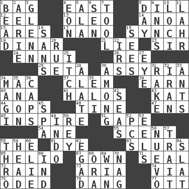 ACROSS 1. Paper or plastic container 4. Compass direction 8. Deli pickle 12. Snakelike fish 13. Margarine 14. Small Philippine buffalo 15. Ancient Greek god of war 17. Billionth: prefix 18. Synchronize (abbr.) 19. Middle Eastern gold or silver currency 21. Falsehood 23. Title for a knight 24. World-weariness 26. To riddle 28. Stalk of a moss capsule 30. Nineveh was its capital 34. Apple computer (short form) 37. Clement's nick name 39. Merit 40. Santa ___, CA 41. Rings 43. Krazy ___ of comics 44. Republicans 46. Prong on a fork 47. Followers of ems 48. Motivate 51. Open wide 54. One (Scot) 55. Aroma 58. Definite Article 61. Color 63. Plays smoothly or legato 65. Sun: prefix 67. Woman's formal wear 71. Lick closed 72. Water falling in drops from the sky 73. Operatic vocal solo 74. By way of 75. Wrote a lyric poem 76. Mild oath, euphamism for damn 77. Baseball player Mel DOWN 1. Necklace unit 2. Nest on high 3. American astronaut and politician John 4. A really long time 5. Wing 6. Elected rep. 7. Implement 8. 24 hours 9. Taverns 10. Event scenes 11. Cowardly lion portrayer 16. Without 18. Observes 20. Sorrow 22. Big collection agency 25. Hankering 27. Sight organ 29. Having winglike extensions 30. Amid 31. Immoral or dissolute person 32. SW Asia republic 33. Pismires 34. Wise men 35. Soon (poet.) 36. Balmoral and tarboosh 38. Biblical high priest 42. Oceans 45. Health resort 49. Southeast Asian peninsula 50. Marina Del _, California 52. Personal Computers (abbr.) 53. Snakelike fish 56. New (sp.) 57. Distinguishing feature 58. Through, poetically 59. Froth on beer 60. Writer Wiesel 62. Mild oath 64. Narrow board 66. Working for oneself (abbr.) 68. Mouth or opening 69. Acquire through effort 70. Tired old horse