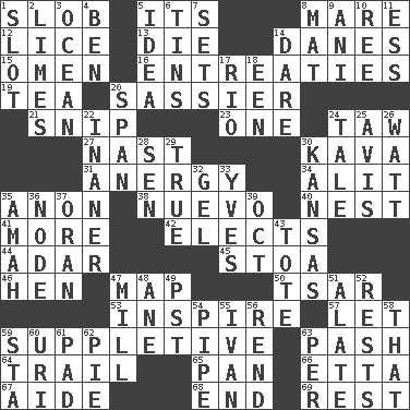 ACROSS 1. Oscar Madison type 5. ___ a Wonderful Life 8. Female horse 12. Louse (plural) 13. Pass on 14. Natives or inhabitants of Denmark 15. Presage 16. Pleas 19. Beverage made from leaves 20. More lively and spirited 21. Sever or remove by pinching or nipping 23. Single 24. The 23rd letter of the Hebrew alphabet 27. Political cartoonist Thomas 30. Polynesian shrub of the pepper family 31. Disorder of the immune system 34. Came down and settled, as after flight 35. Soon (poet.) 38. New (sp.) 40. Egg locale 41. Greater amount 42. Opts 44. The sixth month of the Jewish calendar 45. Portico 46. Layer 47. Atlas unit 50. Russian ruler of old 53. Heighten or intensify 57. Allow 59. Supplementary 63. Romantic infatuation 64. Go after with the intent to catch 65. Baking dish 66. Singer James 67. Assistant 68. Conclusion 69. Repose DOWN 1. Notch 2. Citrus fruits 3. Sea 4. Benjamin's nick name 5. It may be bright or harebrained 6. Canisters 7. Arranges properly for use 8. Floor protector 9. Cuckoo 10. To riddle 11. Double-curved letter 14. Have the gumption 17. River (Sp.) 18. Car or cant ending 20. Connect, as a bridge 22. Sillier 24. Lie 25. Advice 26. Electrical Unit 28. Elected rep. 29. Loyal 30. Sunflower state 32. Set 33. Jacques Cousteau's middle name 35. Nanny 36. Connecting point 37. Northwest Algerian city 39. Sep. follower 43. Carry 47. Place where flour is made 48. A saturated hydrocarbon 49. Pacific Standard Time (abbr.) 51. Having winglike extensions 52. Musical pauses 54. Corncob 55. _ the terrible 56. Tear apart 58. Not this but _ 59. R.R. building 60. RI univ. 61. Groovy apt. 62. Sliced dessert 63. For each
