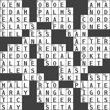 ACROSS 1. Commissioned military rank (abbr.) 4. Mitch Miller's instrument 8. Housemaid (var.) 11. Dutch treat 13. Insides of hands 15. Lower and raise head in agreement 16. Comfort 17. Hang back 18. Drawstring 19. Narrow boards 21. Back 22. Washington bills 23. Snakelike fish 24. Curvy letter 27. Prohibit 29. Of or related to the anus 30. Following 34. Dripping 36. Monthly bill 39. Odor 40. Make new 41. Perfect 43. Migrant worker of the '30s 44. Place in a line 46. Flatfish 47. Fish or hair follower 48. Entreaties 49. Compass direction 51. Lion 53. What Jean-Claude Killy likes to do 54. Fast jet (abbr.) 57. Shopping center 60. _ de Janeiro 63. Food holder 65. Like ___ of sunshine 66. White American of non-Hispanic descent 69. Composer Stravinsky 70. Nervous spasm 71. Contemptuous expression 72. Snakelike fish 73. Declare 74. Stalk of a moss capsule 75. Observe DOWN 1. Honkers 2. Peak District village in England 3. Relating to the nose 4. Elect 5. Oblong piece of solid material 6. Norwegian king 7. Arab leader 8. At once, immediately (arch.) 9. Greater amount 10. Sums up 12. Was introduced to 14. Messy guy 18. Meet 20. Elected rep. 25. Indian skirt 26. Bobsleighs 28. American Automobile Association (abbr.) 29. Without tonality 31. Puff or smoke 32. Give off 33. Actress Charlotte 34. Water source 35. Singer Brickell 37. Modern: prefix 38. Lies 40. Reproach for some lapse or misdeed 42. Path through which fluid escapes 45. Compass dir. 50. Small drink 52. Mouths or openings 54. Gurus 55. Took without asking 56. Laconic 57. Floor protectors 58. Roberta Peters solo 59. Made of lace 61. Taverns 62. Double curve, resembling the letter S 64. Untruth 67. Allow 68. Mouth or opening