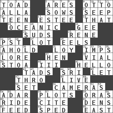 ACROSS 1. Frog relative 5. Ancient Greek god of war 9. Von Bismarck 13. Silent film actress Nazimova 14. Sty mamas 15. Ooze 16. Adolescent 17. First name in cosmetics 18. Not this but _ 19. Pertaining to the sea 21. Turn to the right 22. Soap bubbles 23. French philosopher Descartes 24. Pacific Standard Time (abbr.) 27. Car dealer's back yard 28. Snakelike fish 29. Hold, grip (Informal) 31. Myrna of the movies 32. Naughty children 36. Old wives' tales, e.g. 37. Layer 38. Small bottle 39. Portico 40. One more than two 41. Phone greeting 42. Small boys 44. _ Lanka 46. Allow 47. Through, poetically 48. Moving, as bait 50. Put into a specified state 51. Devices for capturing images 54. The sixth month of the Jewish calendar 56. Ground plans 58. Mouths or openings 60. Travel on an animal 61. Quote 62. Habitations of wild animals 63. Nourish 64. Hurried 65. 90 degrees DOWN 1. Make lace 2. Margarine 3. Actor Baldwin 4. Natives or inhabitants of Denmark 5. Help 6. College mil. group 7. She-sheep 8. Compass dir. 9. Clearly or manifestly demonstrative 10. Giggle 11. Beverage made from leaves 12. Elect 17. Inside; within (prefix) 20. Old (Scot.) 21. Set 23. Marina Del _, California 24. Friends 25. Attempt 26. "Corrida" creature 28. Period of immesurable duration 30. Resembling or made to resemble leather 31. Flowery wreath 33. Place where flour is made 34. Light colored 35. Narrow, elongated depression 37. Part of HMS, perhaps 40. Wedding promise 41. Hub of activity 43. Tate display 44. Scheduled 45. Basketball hoops 47. Sadhe (variant) 49. Wear away 51. ____ d'Azur (French Riviera) 52. Length times width 53. Without 54. Sandy's bark 55. Expire 56. Personal Computers (abbr.) 57. Mouth edge 59. Fast jet (abbr.)