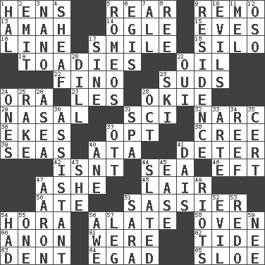 ACROSS 1. Coop moms 5. Posterior 9. San ____ (Riviera town) 13. Wet nurse 14. Stare at amorously 15. Nights before holidays 16. Actor's bit 17. Grin 18. Grain storage tower 19. Sycophants 21. Petroleum 22. Fine (Spanish) 23. Beer foam 24. Mouth or opening 27. French article 28. Migrant worker of the '30s 29. Rhinal 31. _-fi 32. Drug cop 36. Makes supply last 37. Elect 38. Algonquian 39. Oceans 40. "One Day ___ Time" 41. Prevent from occurring 42. Is not 44. Ocean 46. Bank Draft (abbr.) 47. American tennis player Robert 48. Den 50. Had dinner 51. More impudent 54. Israeli folk dance 56. Having winglike extensions 58. Baking chamber 60. Soon (poet.) 61. We are 62. Periodic rise and fall of the sea level 63. Undesirable depression on a surface 64. Mild oath 65. A type of plum DOWN 1. Actor Linden 2. Send forth 3. Billionth: prefix 4. Archer's quiver 5. Lover boys 6. Armor plate that protects the chest 7. 100% 8. To separate or throw off 9. Home 10. Vices 11. Cartoonist voice _ Blanc 12. Bear (Spanish) 17. Trig term 20. Deli pickle 21. Fr. "Yes" 23. What Jean-Claude Killy likes to do 24. Singles 25. Libertine 26. Toward the sea 28. Sep. follower 30. Helper 31. Health resort 33. Johnson of "Laugh-In" 34. Coral collection 35. Foregone conclusion 37. Baseball player Mel 40. A saturated hydrocarbon 41. Raised platform 43. A female animal or person 44. Scheduled 45. Relaxation 47. Composer Copland 49. Disturbances 51. "Two Mules for Sister ____" 52. Morally bad or wrong 53. Make new 54. Possessed 55. Single 56. Deep reverence 57. Part of a journey 59. Born