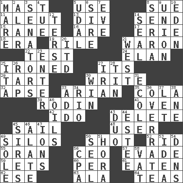 ACROSS 1. Vertical spar for supporting sails 5. Purpose 8. Institute legal proceedings 11. Native American of Southwest Alaska 13. HTML Container Element 14. Transmit 15. The wife of a rajah (variant) 16. "We ___ not amused" (Victoria) 17. 4th largest of the Great Lakes 18. Period 19. Cause heat under the collar 21. Make _____ (do battle with) 22. Trial 24. Style 25. Pressed 27. ___ a Wonderful Life 29. Small pie 30. Compose 32. Domed church section 33. Believer in; advocate of (suffix) 35. Root beer relative 39. "The Thinker" sculptor 41. Baking chamber 42. Wedding promise 43. Keyboard key 45. Move on water 48. One who makes use of a thing 49. Grain storage towers 50. Guess 52. To free from 55. Northwest Algerian city 56. Corporate head (abbr.) 57. Elude 59. Allows 60. For each 61. Ingested 62. Compass dir. 63. Insect wing 64. Afternoon social gatherings DOWN 1. Female horse 2. Having or resembling wings 3. Elected representatives 4. Third day of the wk. 5. Hereditary estate 6. The founder of a family 7. Night before a holiday 8. Father Junipero _ 9. The state of being joined or united 10. Locale of original sin 12. Laconic 14. Lick closed 20. It would 21. 270 degrees 23. Keyboard key 25. Call ___ day 26. Strike 27. Retirement account (abbr.) 28. Shallow baking pan 30. Acquire through effort 31. Learning spot: Fr. 33. Say or write further 34. _ de Janeiro 36. Make much ado about nothing 37. Allow 38. One (Scot) 40. Lubricates 43. Superhero pair 44. First name in cosmetics 45. Founders of families 46. Having winglike extensions 47. Charged atoms 49. Not divided or shared with others 50. Sew up the eyelids of hawks and falcons 51. Israeli folk dance 53. The content of cognition 54. Hiding places for outlaws 56. Numbers guy (abbr.) 58. Large container
