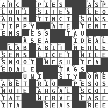 ACROSS 1. Curve 4. Sliced desserts 8. Viper 11. Australian parrot (variant) 13. Settings 15. Lion 16. First man 17. A color or tint 18. Sty mamas 19. Likely to tip or tilt 21. Had dinner 22. Portable shelter 23. Followers of ems 24. Double-curved letter 27. The 19th letter of the Greek alphabet 29. At sea 30. Standard of perfection 34. Experiment locale 36. "This won't hurt ____!" 39. Haggard of country music 40. Elected reps. 41. It is permitted: Lat. 43. Mediterranean tributary 44. Snob 46. Soft 47. Afternoon social gathering 48. Peak District village in England 49. Labels 51. Single; one (prefix) 53. Filthy place 54. Single 57. Collude with 60. River (Sp.) 63. Mexican monetary units 65. Make mention of 66. Therefore, facetiously 69. Native of Scotland 70. Make lace 71. Boldness 72. Relaxation 73. Call ___ day 74. Oceans 75. To sift DOWN 1. Having winglike extensions 2. "The Thinker" sculptor 3. Dice game 4. Pacific Standard Time (abbr.) 5. One more than two 6. Inactive volcano in Sicily 7. Religious group 8. Medicinal plant 9. Stitched 10. Mail 12. Naughty child 14. Proofreading order 18. SAT takers 20. It is so 25. Lick closed 26. Unit of acoustic absorption 28. Direct toward a target or goal 29. Utter; complete 31. One of the Great Lakes 32. Silent film actress Nazimova 33. Area sheltered from the wind 34. Grant temporary use of 35. Small Philippine buffalo 37. Frozen water 38. Trials 40. Compass dir. 42. Not this but _ 45. Nine, plus one 50. Hustle 52. SW Asia republic 54. Witty Wilde 55. Trap for birds or small mammals 56. First name in cosmetics 57. Opposed to 58. Water vessel 59. Singer James 61. Angers 62. Legendary monster 64. Compass dir. 67. Actress Gardner 68. French article