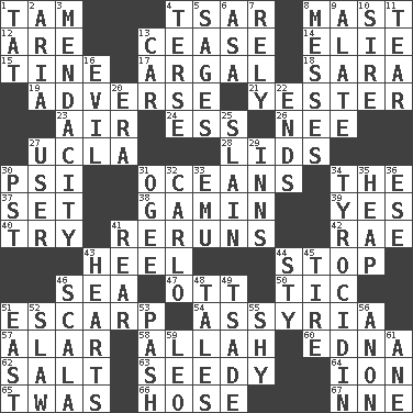 ACROSS 1. Scottish cap 4. Russian ruler of old 8. Vertical spar for supporting sails 12. "We ___ not amused" (Victoria) 13. Desist 14. Writer Wiesel 15. Prong on a fork 17. Therefore, facetiously 18. "Two Mules for Sister ____" 19. Contrary to your interests or welfare 21. Of or pertaining to yesterday 23. Wind 24. Double-curved letter 26. Born 27. Southern CA. univ. 28. Flaplike coverings 30. 23rd letter of the Greek alphabet 31. Seas 34. Definite Article 37. Arrange properly for use 38. Street urchin 39. Consenting reply 40. Attempt 41. Summer TV shows 42. Actress Charlotte 43. The bottom of a shoe or boot 44. Cease 46. Ocean 47. Baseball player Mel 50. Nervous spasm 51. Fortification 54. Nineveh was its capital 57. Having or resembling wings 58. Assad's deity 60. Pulitzer Prize-winning author Ferber 62. Table seasoning 63. Shabby and untidy 64. Electrically charged atom 65. It was, poetically 66. Stockings 67. Compass dir. DOWN 1. Make lace 2. Roberta Peters solo 3. Ananias' fault 4. Laconic 5. Gurus 6. White ___ sheet 7. Depend 8. Makes clutter 9. Having winglike extensions 10. Father 11. Rend 13. 4-wheeled motor vehicle 16. Morally bad or wrong 20. Period 22. Conclusions 25. Killed 27. One who uses or employs something 29. Taverns 30. Pacific Standard Time (abbr.) 31. Double curve, resembling the letter S 32. Monte _, Las Vegas Hotel/Casino 33. Australian flightless bird 34. Polypeptide antibiotic 35. Pile 36. Compass dir. 41. Located in or toward the back 43. Centers 44. Filthy place 45. Become fatigued 46. Any of the three canals of the cochlea 48. Falsehoods 49. Sadhe (variant) 51. Compass direction 52. Cole _ (cabbage dish) 53. Romantic infatuation 55. Like a shrinking violet 56. At once, immediately (arch.) 59. Lion 61. One (Scot)