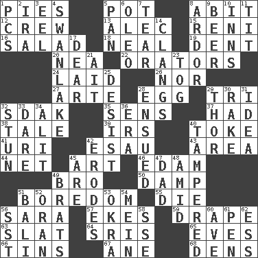 ACROSS 1. Sliced desserts 5. Plant holder 8. "This won't hurt ____!" 12. Group working together 13. Actor Baldwin 15. Painter Guido (1575-1642) 16. Vegetable dish 18. Actress Patricia 19. Undesirable depression on a surface 20. Teachers' org. 22. Speakers 24. Put down 26. And not 27. Johnson of "Laugh-In" 28. Oval reproductive body of a fowl 29. Three (prefix) 32. Neighbor of Neb. 35. Elected reps. 37. Possessed 38. Story 39. Big collection agency 40. Casino tip 41. RI univ. 42. He sold his birthright 43. Length times width 44. Remaining after all deductions 45. Nonscientific branch of learning 46. Dutch treat 49. Sis' sibling 50. Moist 51. Mood resulting from idleness 55. Expire 56. "Two Mules for Sister ____" 57. Makes supply last 59. Window treatment 63. Narrow board 64. Indian titles of respect 65. Nights before holidays 66. Metal containers 67. One (Scot) 68. Cub Scout units DOWN 1. Personal Computers (abbr.) 2. Lyricist Gershwin 3. Snakelike fish 4. Tchaikovsky ballet 5. Baking dish 6. Butter sub 7. Pull apart 8. Zeal 9. Fermented drink made from hops 10. Taverns 11. Teat (slang) 14. Gives out a loud, resonant sound 17. Letter starter 21. Small island 23. Coat; cloak 25. Cease 28. Followed as a consequence or result 29. Son of Odin 30. Immoral or dissolute person 31. The main thing one is thinking about 32. Astound 33. Have the gumption 34. Set down 36. Period 40. ________ with (broke a safety seal) 42. Eats (away) 45. "We ___ not amused" (Victoria) 47. June honoree 48. Among 49. Naughty children 51. Indonesian resort city 52. Northwest Algerian city 53. Gumbo ingredient 54. Chow _ 56. Fast jet (abbr.) 58. Compass dir. 60. "___ Maria" 61. Fenced enclosure 62. Curvy letter
