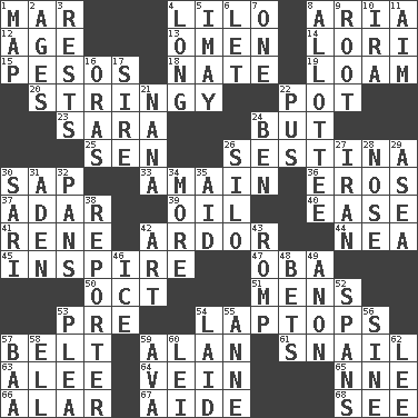 ACROSS 1. Spoil 4. _ and Stitch 8. Roberta Peters solo 12. Personal question 13. Presage 14. Australian parrot (variant) 15. Mexican monetary units 18. Nathan's nickname 19. Rich soil 20. Slender, wiry 22. Plant holder 23. "Two Mules for Sister ____" 24. With the exception that 25. Elected rep. 26. French poetic form 30. Plant excrement 33. With great haste 36. Greek god of love 37. The sixth month of the Jewish calendar 39. Lubricate 40. Comfort 41. French philosopher Descartes 42. Zeal 44. Teachers' org. 45. Motivate 47. Chief or king in Benin or Nigeria 50. Sep. follower 51. Not women's 53. Before (prefix) 54. Portable computers 57. Waist strap 59. ____ Jay Lerner 61. Slow-paced one 63. Toward shelter 64. Distinctive style or manner 65. Compass dir. 66. Having or resembling wings 67. Helper 68. Perceive with the eye DOWN 1. Atlas unit 2. Ripens 3. Musical pauses 4. Protracted 5. "If ____ say so..." 6. Allow 7. Single 8. One to whom something is allotted 9. Carrot, for example 10. Retirement account (abbr.) 11. Direct toward a target or goal 16. Mouths or openings 17. Title for a man of rank and authority 21. Grandmother 22. Product of festering 24. Benjamin's nick name 26. Grain storage tower 27. SW Asia republic 28. Olfactory organ 29. Toward the sea 30. Indian skirt 31. Arabian gulf 32. Zero-star reviews 34. Greater amount 35. Help 38. Newsperson 42. Nonscientific branch of learning 43. Frolic 46. Frozen water 48. Antes 49. Soon (poet.) 52. Connects, as a bridge 53. Entreaty 54. Put down 55. Queen of England 1702-14 56. Trig term 57. Sound made by sheep 58. Pipe bend 59. Actress Gardner 60. Luau accessory 62. Area sheltered from the wind