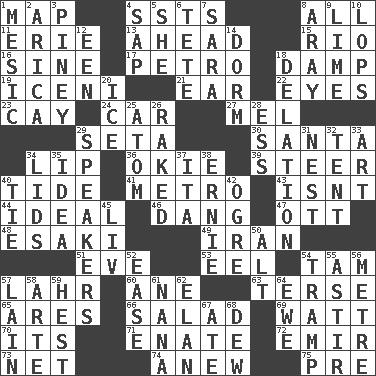 ACROSS 1. Atlas unit 4. Fast planes 8. Everything 11. 4th largest of the Great Lakes 13. At or in the front 15. _ de Janeiro 16. Trig term 17. Stone: prefix 18. Moist 19. Ancient Celtic tribe of eastern Britain 21. Ewer handle 22. Snake ____ (dice throw) 23. Island 24. Automobile 27. Cartoonist voice _ Blanc 29. Stalk of a moss capsule 30. Before Barbara or Clara 34. Mouth edge 36. Migrant worker of the '30s 39. Guide 40. Periodic rise and fall of the sea level 41. Paris' subway 43. Is not 44. Standard of perfection 46. Mild oath, euphamism for damn 47. Baseball player Mel 48. 1973 Nobel Price Winner (Physics) Leo 49. SW Asia republic 51. First lady 53. Snakelike fish 54. Scottish cap 57. Cowardly lion portrayer 60. A saturated hydrocarbon 63. Laconic 65. Ancient Greek god of war 66. Vegetable dish 69. Electrical Unit 70. ___ a Wonderful Life 71. Related on the mother's side 72. Independent ruler or chieftain 73. Fish or hair follower 74. Afresh 75. Before (prefix) DOWN 1. Of or pertaining to a meson 2. N. Chile seaport 3. Abounding in pines 4. Plant excrement 5. A female animal or person 6. False hair 7. "Two Mules for Sister ____" 8. Like ___ of sunshine 9. Citrus frut 10. Chops off 12. Car or cant ending 14. Dormintory (informal) 18. Conveyance 20. Frozen water 25. Tiny particle 26. Moved through 28. Double-curved letter 29. Orators 31. A home for chicks 32. Portable shelter 33. Nonscientific branch of learning 34. Hats (slang) 35. The content of cognition 37. Call ___ day 38. Bert's buddy 40. Make a knot 42. Legendary monster 45. 54 in ancient Rome 50. The first octave above the treble staff 52. Relaxation 54. _____ steamer (cargo ship) 55. Being in motion 56. Distance measurement (Brit.) 57. (Had) reclined 58. Johnson of "Laugh-In" 59. Command 61. Nanny 62. Liveliness 64. She-sheep 67. Had dinner 68. Morning condensation