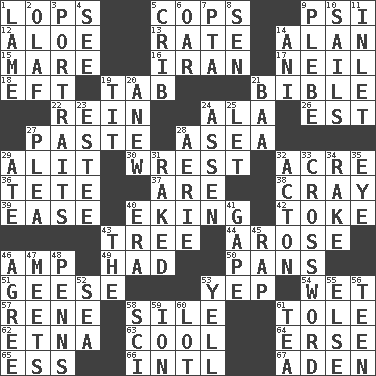 ACROSS 1. Chops off 5. 911 reaches them 9. 23rd letter of the Greek alphabet 12. Medicinal plant 13. Assign a rank or rating to 14. Actor Alda or Thicke 15. Female horse 16. SW Asia republic 17. Famous astronaut Armstrong 18. Bank Draft (abbr.) 19. Keyboard key 21. Instruction Manual for Humans 22. It's straight from the horse's mouth 24. Insect wing 26. Eastern Standard Time (abbr.) 27. Thick mixture 28. Toward the sea 29. Came down and settled, as after flight 30. Obtain by seizing forcibly or violently 32. Land measure 36. Wig 37. "We ___ not amused" (Victoria) 38. Supercomputer manufacturer 39. Relaxation 40. Supplementing with great effort 42. Casino tip 43. Relationship diagram 44. Came up 46. Electrical Unit 49. Possessed 50. Baking dishes 51. Honkers 53. Slangy assent 54. Soggy 57. French philosopher Descartes 58. Filth; sediment 61. Lacquered or enameled metalware 62. Inactive volcano in Sicily 63. Calm and collected 64. Celtic language 65. Double-curved letter 66. International (abbr.) 67. An important port of Yemen DOWN 1. Unable to walk 2. Norwegian king 3. Likenesses of persons 4. Observe 5. Baby bed with high sides 6. Boat paddle 7. Parent Teacher Assoc. 8. Elected rep. 9. Cadet 10. Moves on water 11. An arm off of a larger body of water 14. Cuckoo 19. Teat (slang) 20. Afresh 21. Sound made by sheep 23. First name in cosmetics 24. NE Netherlands city 25. Allow 27. Entreaty 28. Nest on high 29. Had dinner 31. Moved through 32. NE Massachussets city 33. What you're doing now 34. Immoral or dissolute person 35. Sight organ 40. Epoch 41. Stare wonderingly 43. Definite Article 45. Strike 46. Match 47. Confronts 48. Actor Sean's family 52. Ocean 53. Shout 55. Otherwise 56. Adolescent 58. _-fi 59. Electrically charged atom 60. Car dealer's back yard 61. Beverage made from leaves