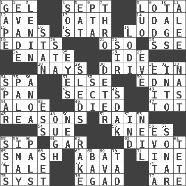 ACROSS 1. Set 4. Back-to-school mo. 8. Globular water bottle used in Asia 12. "___ Maria" 13. Pledge 14. Allodial 15. Zero-star reviews 17. Play the lead 18. Cabin 19. Prepares for publication 21. Bear (Spanish) 23. Compass dir. 24. Related on the mother's side 26. Binary compound 28. Negative votes 30. Popular '50s hangout 34. Health resort 37. Otherwise 39. Pulitzer Prize-winning author Ferber 40. Baking dish 41. Religious groups 43. It is 44. _ vera 46. Passed on 47. Small child 48. Thinks logically 51. Precipitation 54. Institute legal proceedings 55. Leg joints 58. Small drink 61. Slender fish 63. A piece of turf (Scot.) 65. Box-office sellout 67. Blind as ____ 71. Actor's bit 72. Story 73. Polynesian shrub of the pepper family 74. Make lace 75. System (abbr.) 76. Mild oath 77. "We ___ not amused" (Victoria) DOWN 1. Stare wonderingly 2. Elude 3. Soviet premier 1918-24 4. Mayday 5. Erode 6. Parent Teacher Association (abbr.) 7. Through, poetically 8. Nilotic language 9. Probability 10. Labels 11. Toward shelter 16. Comedian Laurel of Laurel & Hardy 18. Farming town in central California 20. R.R. building 22. Title for a knight 25. Snake ____ (dice throw) 27. First lady 29. Bobsleighs 30. Prevent from occurring 31. Prepare for publication 32. To the inside or interior of 33. Political cartoonist Thomas 34. Coast Guard woman 35. Light colored 36. Small Philippine buffalo 38. _-fi 42. Neighbor of Neb. 45. Curvy letter 49. Ending for "Through" and "Enough" 50. Teachers' org. 52. Working for oneself (abbr.) 53. Famous astronaut Armstrong 56. Webber/Rice musical 57. Underwater navigation system 58. Fast planes 59. "If ____ say so..." 60. Friends 62. Immoral or dissolute person 64. Wig 66. Put into a specified state 68. Paper or plastic container 69. Actress Gardner 70. Small boy