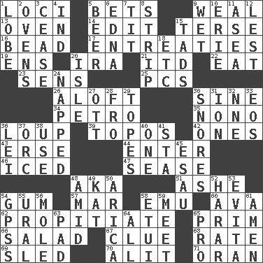 ACROSS 1. Event scenes 5. Stakes 9. Welt 13. Baking chamber 14. Prepare for publication 15. Laconic 16. Necklace unit 17. Pleas 19. Followers of ems 20. Retirement account (abbr.) 21. It would 22. Erode 23. Elected reps. 25. Personal Computers (abbr.) 26. High up in or into the air 30. Trig term 34. Stone: prefix 35. Words to Nanette 36. Central Nebraska county 39. Literary convention 42. Singles 43. Celtic language 44. Keyboard key 46. On the rocks 47. Gospel singer Marvin 48. Alias (abbr.) 51. American tennis player Robert 54. Chewing product 57. Spoil 58. Australian flightless bird 60. Actress Gardner 62. Conciliate 65. Demure 66. First course 67. A slight indication 68. Pace 69. Downhill vehicle 70. Set down 71. NW Algerian seaport DOWN 1. Ear part 2. Baking chambers 3. Desist 4. Indiana (abbr.) 5. Fermented drink made from hops 6. Pulitzer Prize-winning author Ferber 7. Teat (slang) 8. Long narrow piece of something 9. Soggy 10. 4th largest of the Great Lakes 11. Toward the sea 12. For fear that 15. Small boys 18. And so on (abbr.) 20. Capri or Wight 24. Slept 27. Baseball player Mel 28. Back 29. Drinks excessively 30. Sounds asleep 31. Electrically charged atom 32. Compass dir. 33. Greek goddess of the dawn 36. Flowery wreath 37. The grampus (Milton) 38. Purpose 40. Single 41. R.R. building 45. He sold his birthright 48. Among 49. Krazy ___ of comics 50. N. Chile seaport 52. Ethiopian city, capital of Harari 53. Webber/Rice musical 54. Global Positioning Systems (abbr.) 55. Mountain range 56. Undercover agent 58. Needle holder 59. Rendezvous 61. So be it 63. Groovy apt. 64. 100% 65. Adept person