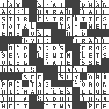 ACROSS 1. The 23rd letter of the Hebrew alphabet 4. Petty quarrel 8. NW Algerian seaport 12. Land measure 14. Ethiopian city, capital of Harari 16. Lie 17. Use a spoon 18. Pleas 20. "_____ Recall" 22. Scottish cap 23. Remaining after all deductions 24. Compass dir. 25. Bear (Spanish) 28. Friend of Pooh 30. Colored 31. Feeling or showing extreme anger 35. Oct. 31 cry 37. Does sums 40. Greek god of love 41. Post 42. Soviet premier 1918-24 44. Allows 45. Cassini of fashion 46. Pace 47. Compass dir. 48. Fertile tracts in a desert 50. Relaxation 52. Observe 54. Roguish 55. Mouth or opening 58. Adept person 61. Label 63. Person of subnormal intelligence 65. Complicated, petty procedures 70. A slight indication 71. It may be bright or harebrained 72. Snob 73. Ancient Roman robe 74. Confront 75. Inactive volcano in Sicily 76. For each DOWN 1. Clothes sense 2. Gambison 3. Compose 4. A female animal or person 5. Baking dish 6. Nonscientific branch of learning 7. Small pie 8. Baseball player Mel 9. Precipitation 10. Toward shelter 11. Egg locale 13. Epoch 15. Posterior 19. Mine, in Marseilles 21. Myrna of the movies 26. Lick closed 27. More peculiar 29. Threatening words 30. Evades 32. Ancient Greek god of war 33. Carry 34. Curvy letter 35. Actor Lugosi 36. Singles 38. Heredity factor (abbr.) 39. Settings 41. "Barney Miller" actor Jack 43. Actress Patricia 49. Stalk of a moss capsule 51. Symbol (abbr.) 53. Hearing organs 55. Lowest deck of a ship 56. Makeup applied to the cheeks 57. Approach 58. Demure 59. Travel on or in a vehicle 60. Double curve, resembling the letter S 62. Went 64. Sep. follower 66. Floor protector 67. Car dealer's back yard 68. A really long time 69. R.R. building