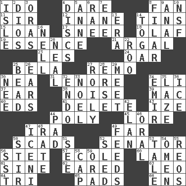 ACROSS 1. Wedding promise 4. Have the gumption 8. Avid follower 11. Title for a knight 12. Lacking in sense or substance 14. Airtight sealed metal containers 15. Grant temporary use of 17. Scornful expression 18. Norwegian king 19. Gist 21. Therefore, facetiously 23. French article 24. Boat paddle 25. Actor Lugosi 27. San ____ (Riviera town) 30. Teachers' org. 31. Poe poem 34. Connecticut Ivy Leaguer 37. Hearing organ 38. Annoying sound 39. Apple computer (short form) 40. Begley and Asner 41. Erase 43. Ending with capital 44. Much (prefix) 45. Old wives' tales, e.g. 47. Retirement account (abbr.) 49. At a great distance 50. Heaps 52. Elected representative 56. Proofreading order 57. Learning spot: Fr. 60. Unable to walk 61. Trig term 62. Having ears or earlike features 63. Lion 64. Three (prefix) 65. Groovy apts. 66. Followers of ems DOWN 1. Capri or Wight 2. "Vaya con ____" 3. Mouths or openings 4. Plates 5. Queen of England 1702-14 6. Actress Charlotte 7. Compass dir. 8. Of or pertaining to a thread or threads 9. Of or related to the anus 10. Science/research agcy. 13. Epoch 14. Ancient Roman robe 16. 1994 drama film starring Jodie Foster 20. Be tempered by heat 22. Friend of Pooh 25. Necklace unit 26. Hearing organs 27. Agitated, as a liquid 28. Celtic language 29. Confront 30. Born 32. Inside; within (prefix) 33. Christmas carol 34. Independent ruler or chieftain 35. Goldbrick 36. Frozen water 42. Style 44. Writing tablet 46. Spoken 47. Ancient Celtic tribe of eastern Britain 48. Pace 49. Gives food to 50. Disorderly outburst 51. Observe 52. Downhill vehicle 53. Falsehood 54. Presage 55. Vintage cars 56. Fast jet (abbr.) 58. Head covering 59. Mouth or opening