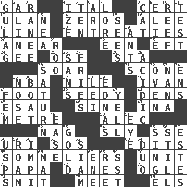 ACROSS 1. Slender fish 4. Slanted text style (abbr.) 8. An absolute certainty 12. ____ Bator, Mongolia 14. Nothings 16. Toward shelter 17. Actor's bit 18. Pleas 20. Approach 22. Car or cant ending 23. Lizard (obsolete) 24. Unit of force equal to gravity 25. Order of Saint Francis (abbr.) 28. R.R. building 30. Fly high 31. Biscuitlike quick bread 35. Basketball assoc. 37. "Death on the ____" 40. "Terrible" tsar 41. Lowest support of a structure 42. Shabby and untidy 44. Hiding places for outlaws 45. He sold his birthright 46. Trig term 47. _ tizzy (2 wds.) 48. Distance measurement (Brit.) 50. Actor Baldwin 52. Tired old horse 54. Secret 55. Compass dir. 58. RI univ. 61. Distress signal 63. Prepares for publication 65. Wine waiters 70. A single undivided whole 71. Dad 72. Natives or inhabitants of Denmark 73. Stare at amorously 74. Stricken, poetically 75. Rendezvous 76. Raised railways DOWN 1. Russian prison camp 2. Place in a line 3. The wife of a rajah (variant) 4. Ending with capital 5. "___ Little Indians" 6. Nonscientific branch of learning 7. Old wives' tales, e.g. 8. Feline 9. Writer Wiesel 10. Coral ridge 11. Trial 13. Teachers' org. 15. Perceives with the eye 19. Pismires 21. Friend of Pooh 26. Without 27. Strips of potato fried in deep fat 29. Being or containing an acid 30. Titan orbits this 32. Baking chamber 33. Grandmother 34. Followers of ems 35. Olfactory organ 36. Water vessel 38. Flowery wreath 39. Ferber et al. 41. Opposite of masc. 43. Shout 49. Comfort 51. Sight organ 53. Aureate 55. Burn superficially 56. Not moving 57. _____ Park, CO 58. United States Postal Service (abbr.) 59. Wander aimlessly 60. Body of Kaffir warriors 62. Thailand, formerly 64. Superhero pair 66. Floor covering 67. Compass dir. 68. To separate or throw off 69. Fast jet (abbr.)