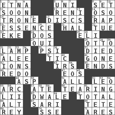ACROSS 1. Inactive volcano in Sicily 5. Single; one (prefix) 8. Arrange properly for use 11. Within a short period 12. Painter Guido (1575-1642) 14. Bear (Spanish) 15. Marketplace scale 17. Plates 18. Reproach for some lapse or misdeed 19. Core 21. Actor Linden 22. Third day of the wk. 23. Make supply last 24. Two (Sp.) 25. Connecticut Ivy Leaguer 27. Fr. "Yes" 28. "Beetle Bailey" pooch 31. Desk light 35. 23rd letter of the Greek alphabet 37. Passed on 38. Toward shelter 39. Nervous spasm 41. Went 42. Charged particles 43. Big collection agency 45. Extremities 46. Redecorate 47. Greek goddess of the dawn 49. Viper 51. Everything 52. Lion 55. Curve 57. Had dinner 60. Pulling apart 62. Cards in a Roman deck? 63. A sleeping potion; an opiate (poet.) 65. Add up to 66. The first octave above the treble staff 67. Indian skirt 68. Wig 69. Marina Del _, California 70. Compass dir. 71. Ancient Greek god of war DOWN 1. First name in cosmetics 2. Cod relative 3. Trap for birds or small mammals 4. Singer Murray 5. RI univ. 6. Delicate 7. South American Indian 8. Determination 9. He sold his birthright 10. Drink excessively 13. Small island 16. Inside; within (prefix) 17. Cease 20. Overturn; upset 26. Cabin 29. Look after 30. Lyric poems 31. Den 32. Medicinal plant 33. Ananias' fault 34. Mexican monetary units 36. One more than two 40. Cause to be 44. Not divided or shared with others 48. Narrow board 50. Writing tablets 52. 61 cubic inches 53. Maternal 54. Stares at amorously 55. Having or resembling wings 56. Cause heat under the collar 58. It was, poetically 59. Hearing organs 61. Round or rotation of duties 64. Untruth