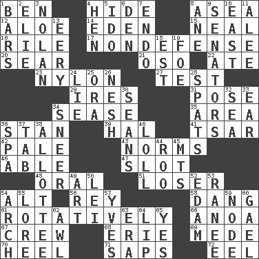 ACROSS 1. Benjamin's nick name 4. Flintstone garb 8. At sea 12. Medicinal plant 14. Paradise 15. Be tempered by heat 16. Cause heat under the collar 17. Unrelated to defense, as in spending 20. Burn superficially 21. Bear (Spanish) 22. Had dinner 23. Thermoplastic polyamide 27. Trial 29. Angers 31. Airs 34. Gospel singer Marvin 35. Type of rug 36. Comedian Laurel of Laurel & Hardy 39. Actor Linden 41. Russian ruler of old 42. Light colored 43. Typical models 46. Competent 47. Position in a hierarchy or organization 48. Of the mouth 51. Failure 54. Keyboard modifier key 56. Marina Del _, California 58. Mild oath, euphamism for damn 61. Happening in regular succession 66. Small Philippine buffalo 67. Group working together 68. 4th largest of the Great Lakes 69. Ancient Persian 70. The bottom of a shoe or boot 71. Plant excrements 72. Snakelike fish DOWN 1. Oblong pieces of solid material 2. Writer Wiesel 3. Pitcher Ryan 4. Layer 5. Wedding promise 6. Lair 7. Inside; within (prefix) 8. A saturated hydrocarbon 9. Elected representatives 10. 90 degrees 11. Toward shelter 13. Suggestive of the supernatural 18. Eastern Standard Time (abbr.) 19. Enemy 24. Untruth 25. Mouth or opening 26. Tender 28. Arguments over trivial matters 30. Actors Connery and Penn 32. Ocean 33. Hearing organ 34. Scornful expression 36. Health resort 37. Bar bill 38. One to whom something is allotted 40. Hang loosely or laxly 44. Friend of Pooh 45. Mountains (abbr.) 49. Tate display 50. Flowery wreath 52. Dutch treat 53. The wife of a rajah (variant) 54. Bowlike part 55. Old wives' tales, e.g. 57. Jacques Cousteau's middle name 59. Thickened enlargement 60. Highlander 62. Leather borer 63. Period 64. Mouth edge 65. Affirmative reply