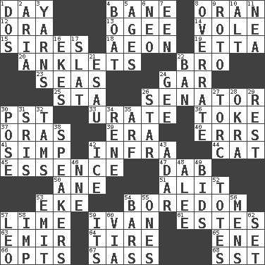 ACROSS 1. 24 hours 4. Object of repulsion 8. NW Algerian seaport 12. Mouth or opening 13. Double curve, resembling the letter S 14. Grand slam 15. Founders of families 18. Period of immesurable duration 19. Singer James 20. Short socks 22. Sis' sibling 23. Oceans 24. Slender fish 25. R.R. building 26. Elected representative 30. Pacific Standard Time (abbr.) 33. A salt of uric acid 36. Puff or smoke 37. Mouths or openings 39. Epoch 40. Blunders 41. Simple or foolish person 42. Kind of red light 44. Feline 45. Center 47. Pat or tap gently 50. One (Scot) 51. Came down and settled, as after flight 53. Make supply last 54. Mood resulting from idleness 57. Citrus frut 59. "Terrible" tsar 61. _____ Park, CO 63. Arab leader 64. Become fatigued 65. Compass dir. 66. Chooses 67. Backtalk 68. Fast jet (abbr.) DOWN 1. Two (Sp.) 2. Roberta Peters solo 3. Tall tales 4. Water vessel 5. Eons 6. Modern: prefix 7. Car or cant ending 8. Make much ado about nothing 9. Printing process, for short 10. Keyboard modifier key 11. Teachers' org. 16. Supplements with great effort 17. Narrow board 21. Son of Isaac 22. Bar 24. Unit of force equal to gravity 26. Play the lead 27. Torque (variant) 28. Gumbo ingredient 29. Repose 30. Airs 31. Indian titles of respect 32. Scottish caps 34. French philosopher Descartes 35. Sandy's bark 38. Orators 42. Frozen water 43. The sixth month of the Jewish calendar 46. Compass dir. 48. Toward shelter 49. Auction offers 52. Hauls 53. Give off 54. Taverns 55. Singles 56. Not women's 57. Lion 58. Naughty child 59. ___ a Wonderful Life 60. By way of 62. Put into a specified state