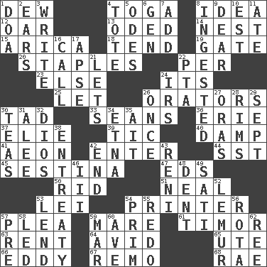ACROSS 1. Morning condensation 4. Ancient Roman robe 8. The content of cognition 12. Boat paddle 13. Wrote a lyric poem 14. A home for chicks 15. N. Chile seaport 18. Watch over 19. Yard entry 20. Paper fasteners 22. For each 23. Otherwise 24. ___ a Wonderful Life 25. Allow 26. Speakers 30. Small amount or degree 33. Seines 36. One of the Great Lakes 37. Writer Wiesel 39. Nervous spasm 40. Moist 41. Period of immesurable duration 42. Keyboard key 44. Fast jet (abbr.) 45. French poetic form 47. Begley and Asner 50. To free from 51. Be tempered by heat 53. Flowery wreath 54. Hard copy producer 57. Entreaty 59. Female horse 61. Southeast Indonesia island 63. Monthly bill 64. Enthusiastic 65. Shoshoni 66. Whirlpool 67. San ____ (Riviera town) 68. Actress Charlotte DOWN 1. ___ good deed 2. Hearing organs 3. Compose 4. Carryall 5. Lyric poems 6. Commissioned mil. rank 7. Increase 8. Consumed 9. Letter starter 10. Eastern Standard Time (abbr.) 11. Had dinner 16. Give a ring to 17. Domed church section 21. Allows 22. Parent Teacher Association (abbr.) 24. Big collection agency 26. Single time 27. Mouths or openings 28. Basketball hoops 29. Back-to-school mo. 30. Beverages made from leaves 31. Toward shelter 32. "Vaya con ____" 34. Inactive volcano in Sicily 35. Small island 38. Plea 42. Conclusion 43. Painter Guido (1575-1642) 46. One more than two 48. Gouge 49. Suttee (variant) 52. Arboreal primate 53. Grant temporary use of 54. Demure 55. Make new 56. Round or rotation of duties 57. Before (prefix) 58. Directed 59. Third mo. 60. "___ Maria" 62. To sift