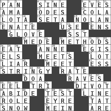 ACROSS 1. Baking dish 4. Trig term 8. Nights before holidays 12. Nanny (var.) 13. Lyric poems 14. Root beer relative 15. Globular water bottle used in Asia 17. Stalk of a moss capsule 18. Pitcher Ryan 19. Maternal 21. Purpose 23. Followers of ems 24. Michael Jackson trademark 26. Fast jet (abbr.) 28. Ancient Persian 30. Modes 34. Consume 37. Queen of England 1702-14 39. Armor plate that protects the chest 40. Raised railways 41. Confronts 43. Car dealer's back yard 44. One who doesn't tell the truth 46. Confront 47. Curvy letter 48. Slender, wiry 51. Assign a rank or rating to 54. ___ good deed 55. All-night dance parties 58. Snakelike fish 61. Three (prefix) 63. A piece of turf (Scot.) 65. Remain 67. Trial 71. Actor's bit 72. Hero or heavy, e.g. 73. Jane of fiction 74. Make lace 75. Frozen precipitation 76. Count _ (2 wds.) 77. "We ___ not amused" (Victoria) DOWN 1. Light colored 2. Amid 3. Brizilian seaport 4. Distress signal 5. Binary compound 6. Fish or hair follower 7. Son of Isaac 8. Environmental prefix 9. Grand slam 10. Flair 11. Without 16. Smallest unit of an element 18. A home for chicks 20. First lady 22. Compass dir. 25. Dutch treat 27. Definite Article 29. Foe 30. Distance measurement 31. Stare 32. "Vaya con ____" 33. Fast planes 34. Snakelike fish 35. Came down and settled, as after flight 36. Russian ruler of old 38. Born 42. Play the lead 45. To free from 49. Short letter 50. Slender fish 52. Small boy 53. Morally bad or wrong 56. Webber/Rice musical 57. Echolocation 58. Hearing organs 59. Inky black, to poets 60. _ and Stitch 62. A distinct part 64. False hair 66. Morning condensation 68. Sight organ 69. _ Lanka 70. Nine, plus one