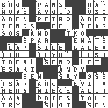 ACROSS 1. Sis' sibling 4. Zero-star reviews 8. Strike 11. Be footloose 13. Prevent the occurrence of 15. Bear (Spanish) 16. Arabian gulf 17. Stone: prefix 18. Collude with 19. Is inclined (to) 21. Snakelike fish 22. Beverages made from leaves 23. Mayday 24. Plus 27. Ring climax 29. Coast Guard woman 30. Maternal 34. Infant locale 36. Drop; flow; fall 39. An organ shaped like a helmet 40. Hoop that covers a wheel 41. Miss Universe 1986, Barbara Palacios _ 43. For fear that 44. Perfect 46. Post 47. Allow 48. 1973 Nobel Price Winner (Physics) Leo 49. "60 Minutes" Commentator Rooney 51. Car or cant ending 53. Declare 54. Compass dir. 57. Russian ruler of old 60. Curve 63. Webber/Rice musical 65. Possessive pronoun 66. Sibling's daughter 69. Set down 70. Auto club (abbr.) 71. Off-Broadway awards 72. Lacquered or enameled metalware 73. Attempt to accomplish something 74. Narrow, elongated depression 75. Elected rep. DOWN 1. Naughty children 2. Cowboy competition 3. Baking chambers 4. Infant food 5. "___ Maria" 6. Observe 7. Title for a man of rank and authority 8. Loose flowing garment 9. At sea 10. Plant holders 12. Conclusion 14. Dunce 18. Without tonality 20. Plant excrement 25. Political cartoonist Thomas 26. Frees from moisture 28. Barrel 29. Orators 31. Toward shelter 32. Trial 33. Consume 34. Hats (slang) 35. Type of rug 37. Sodium hydroxide 38. Ferber et al. 40. Standoff 42. Pulitzer Prize-winning author Ferber 45. Whopper 50. Color 52. Billionth: prefix 54. Grain storage towers 55. Vertical member of a panel or frame 56. Ingested 57. Not this but _ 58. Shrivel 59. Like ___ of sunshine 61. Teases 62. To provide with a ceiling 64. Large container 67. Corporate head (abbr.) 68. Eastern Standard Time (abbr.)