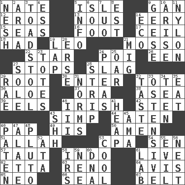 ACROSS 1. Nathan's nickname 5. Capri or Wight 9. Separate the seeds from cotton 12. Greek god of love 13. Horse sense 14. Suggestive of the supernatural 15. Oceans 16. Pick up the tab 17. To provide with a ceiling 18. Possessed 19. Lion 21. With motion or animation 22. Play the lead 24. Luau course 26. Car or cant ending 27. Discontinues 28. Volcanic refuse 29. Carrot, for example 30. Keyboard key 32. Carry 36. _ vera 37. Mouth or opening 38. At sea 39. Snakelike fish 40. From or relating to Ireland 42. Proofreading order 43. Simple or foolish person 44. Ingested 46. Infant food 49. Part of HMS, perhaps 50. So be it 51. Assad's deity 53. Accounting whiz (abbr.) 54. Elected rep. 57. Pulled tight 58. _ china 61. Not recorded 62. Singer James 63. Former U.S. Attorney General Janet 64. Deliberation 65. Modern: prefix 66. Lick closed 67. Waist strap DOWN 1. Tender 2. Type of rug 3. Inedible or poisonous agaric 4. Curvy letter 5. Information 6. "Barney Miller" actor Jack 7. Nilotic language 8. Eastern Standard Time (abbr.) 9. Honkers 10. Originate 11. Thermoplastic polyamide 14. Environmental prefix 19. Infant locale 20. Celtic language 21. Russian fighter aircraft 23. Hauls 24. Entreaties 25. Boat paddle 27. Flatfish 28. Remove all contents or possession from 29. Actress Charlotte 31. Typical models 32. Clothes sense 33. Clearly or manifestly demonstrative 34. Adolescent 35. Consume 40. One more than two 41. Pile 43. Quiet! 45. Wet nurse (var.) 46. Eucharist need 47. Having winglike extensions 48. Mickey's pet 52. "One Day ___ Time" 53. Calm and collected 55. Tending to cause great harm 56. A home for chicks 58. Big collection agency 59. Born 60. Heredity factor (abbr.) 61. Experiment locale